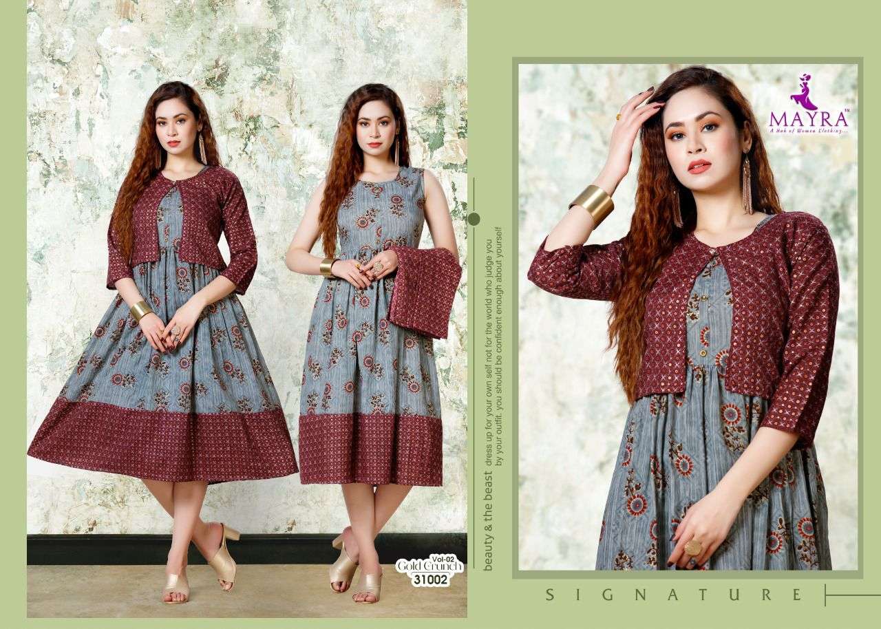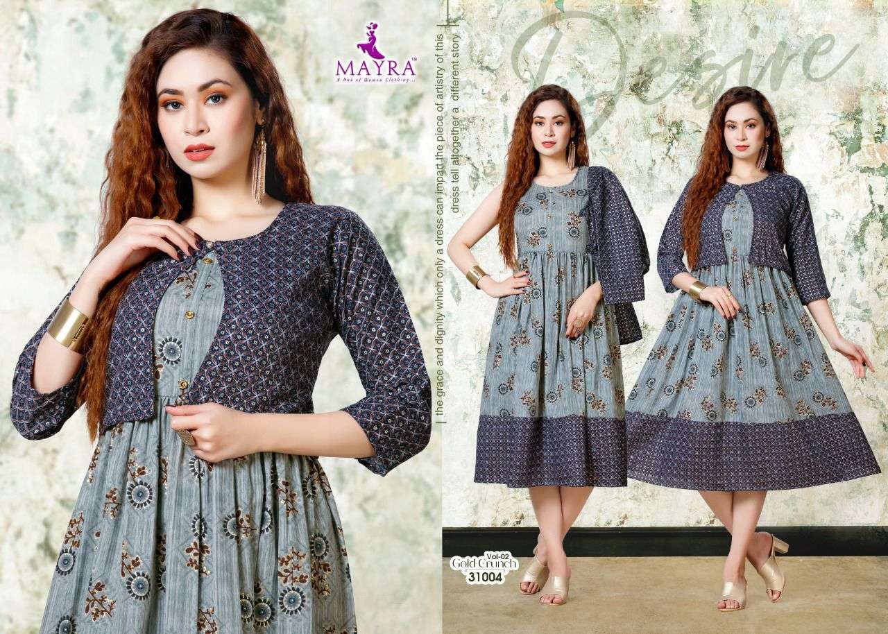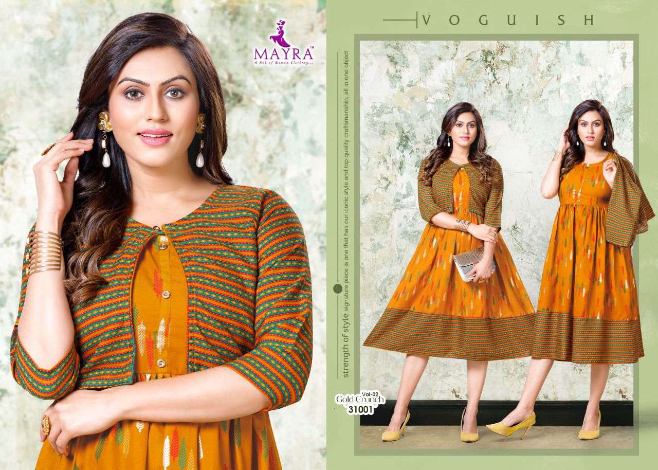 Dear Customers, Welcome to MAYRA (KURTI) .., We are introducing MAYRA 'S new catalog 📕Catalogue:- GOLD CRUNCH VOl-2 👗cloth :- RAyon capsul 14KG Gold print Also separate capsul print Jacket ✅concept :- * Capsul foil print with koti pattern* Length :- 45”MINIMUM Size:- M,L,XL,XXl,XXXL, AVAILABLE 🚛 : Dispatch :- Dispatch after 10 January RATE : 499/- Always with you...👍 |