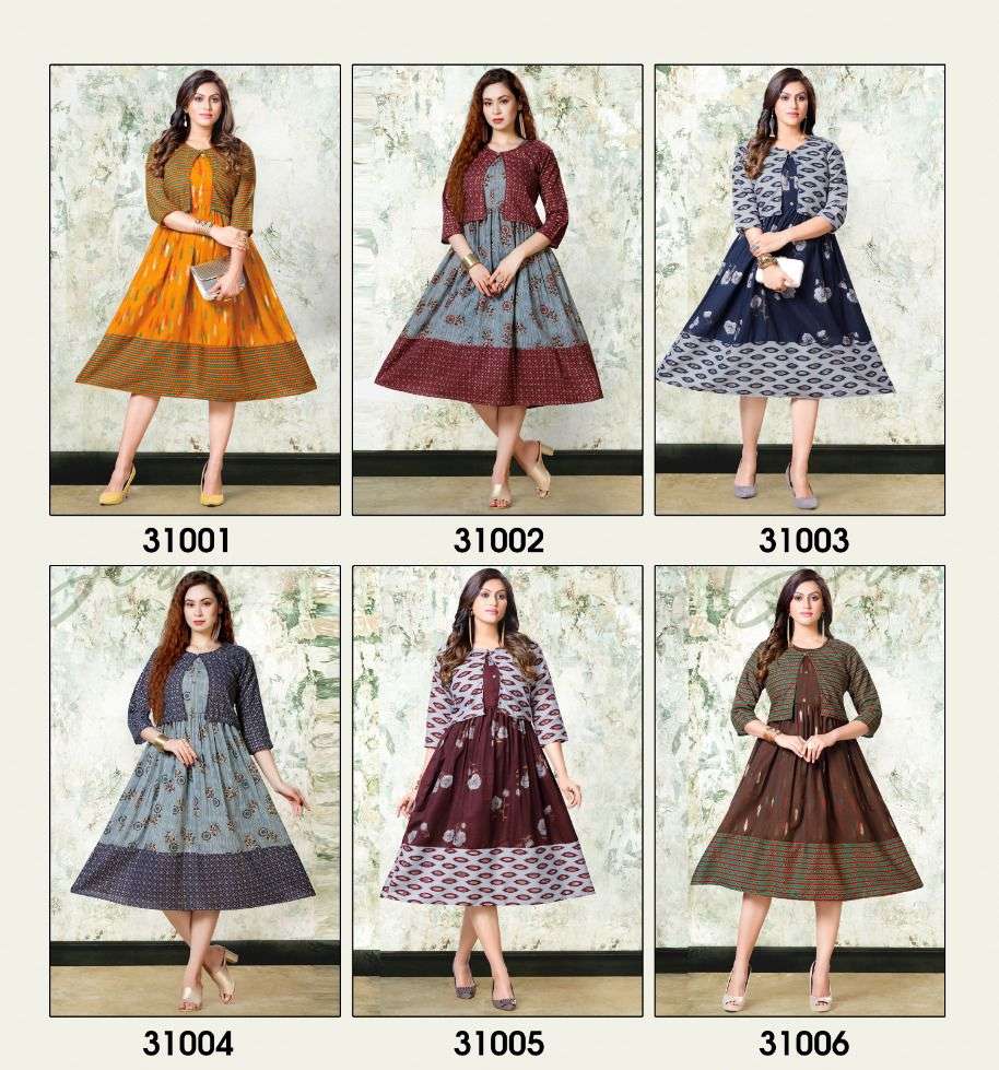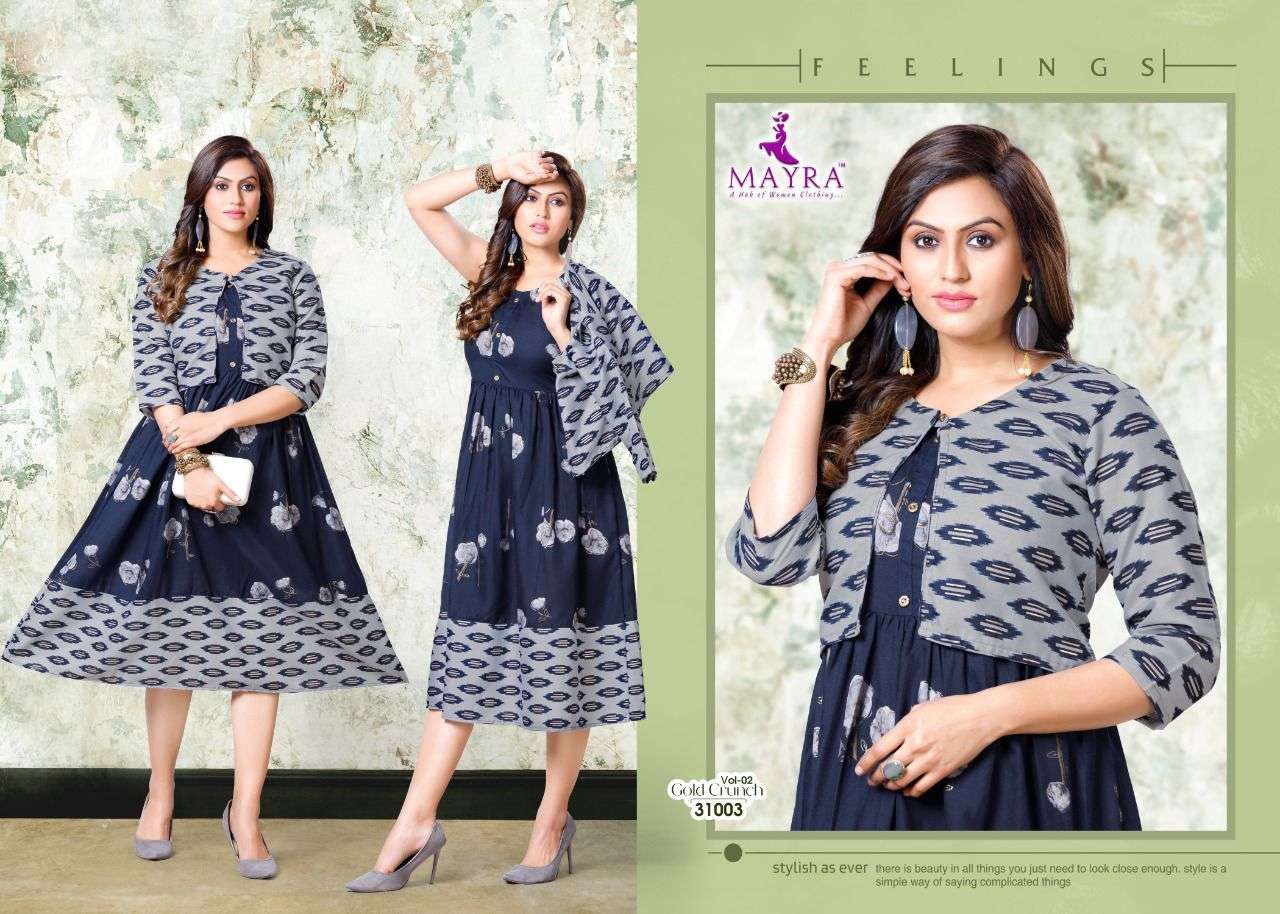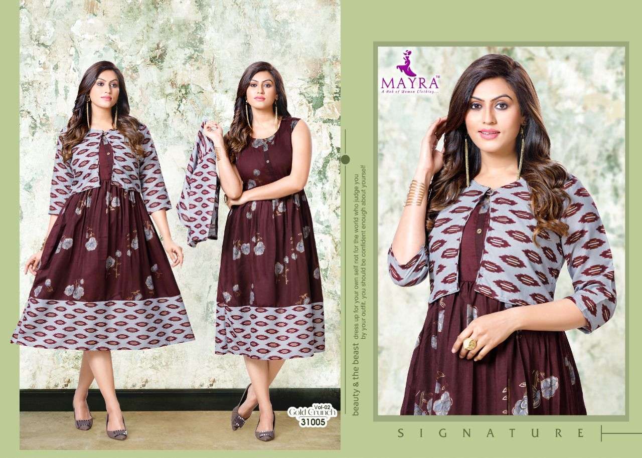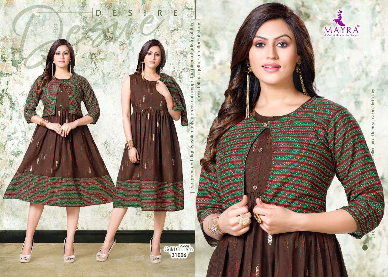 Dear Customers, Welcome to MAYRA (KURTI) .., We are introducing MAYRA 'S new catalog 📕Catalogue:- GOLD CRUNCH VOl-2 👗cloth :- RAyon capsul 14KG Gold print Also separate capsul print Jacket ✅concept :- * Capsul foil print with koti pattern* Length :- 45”MINIMUM Size:- M,L,XL,XXl,XXXL, AVAILABLE 🚛 : Dispatch :- Dispatch after 10 January RATE : 499/- Always with you...👍 |