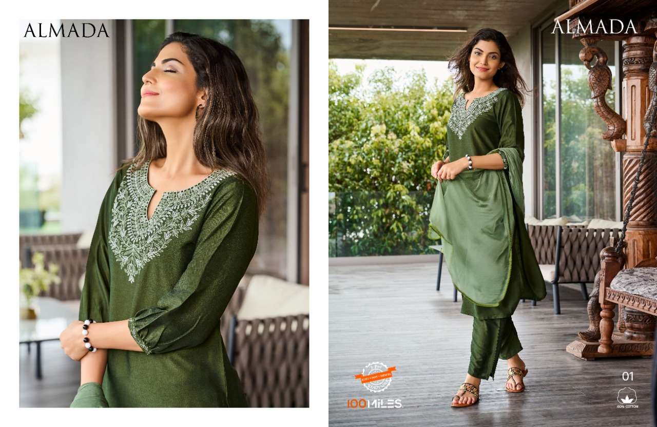 Catalog : ALMADA Style : Kurti + Pant + Dupatta 3 Psc Readymade set TYPE : Fancy blended fabric heavy embroidery 3 psc readymade set. SIZES : M to 2XL |