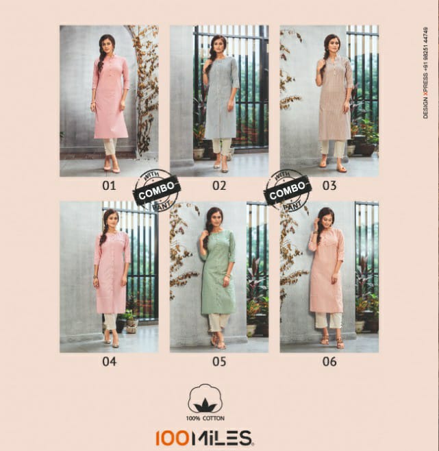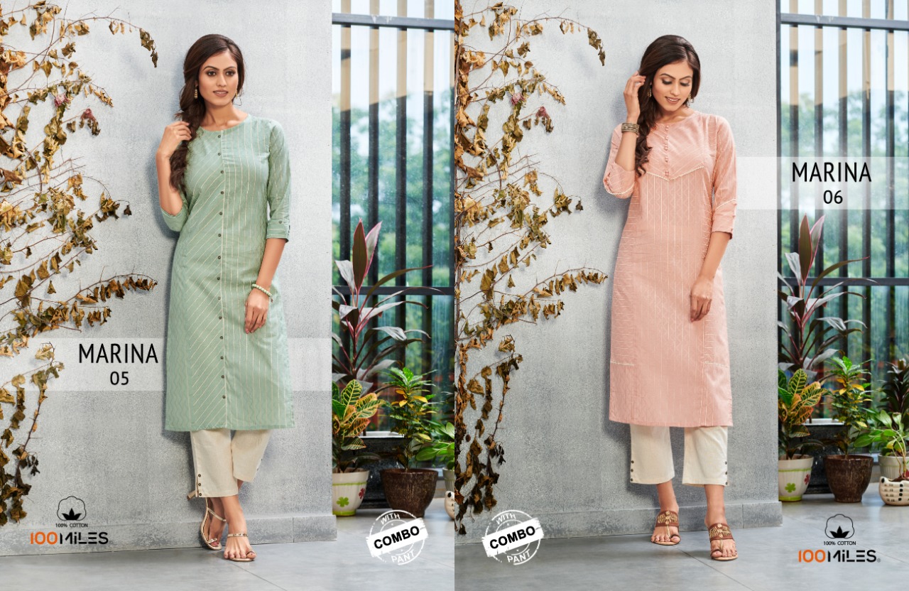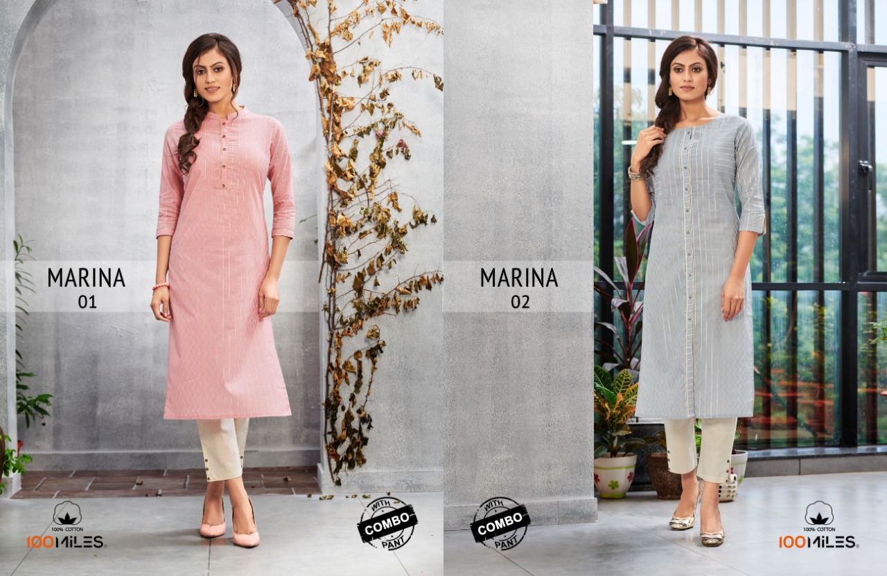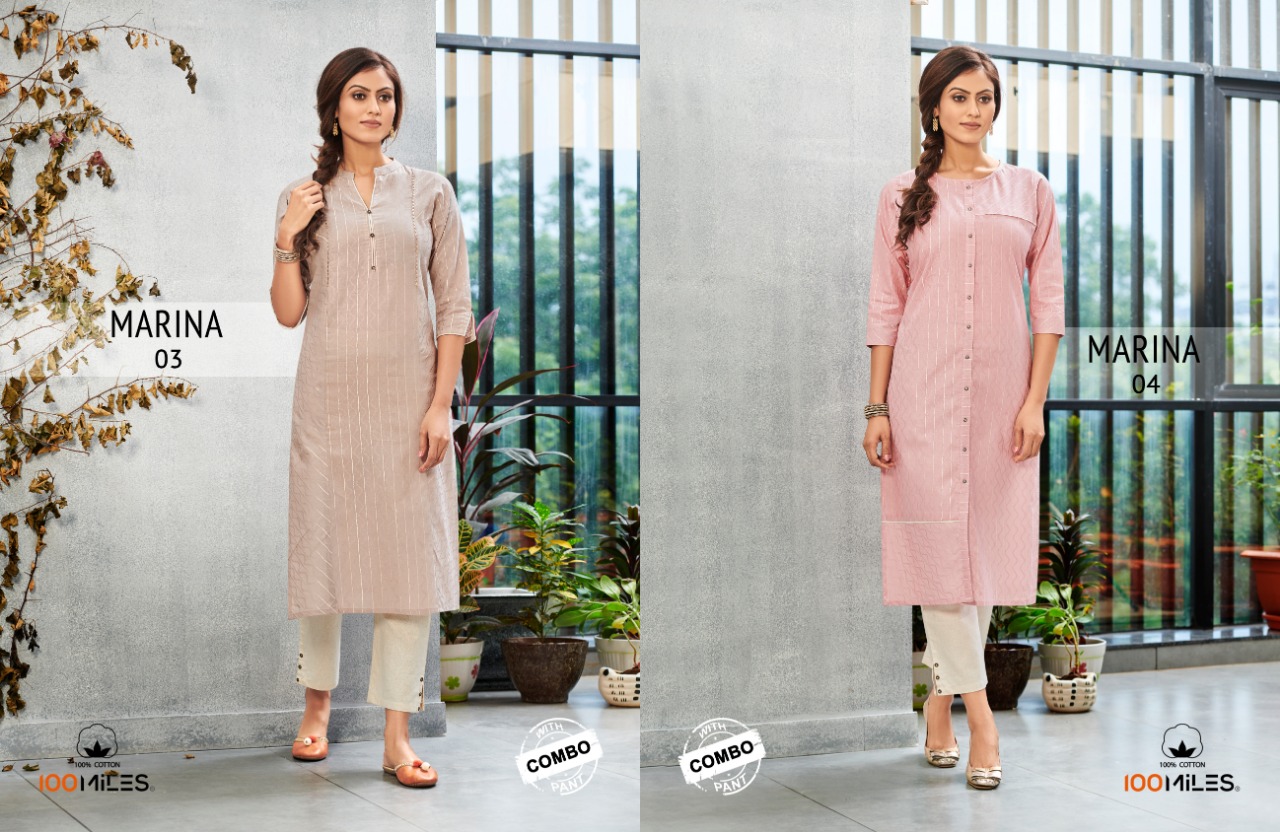 100 Miles Marina Pure Cotton Designer Kurtis With Combo Pants