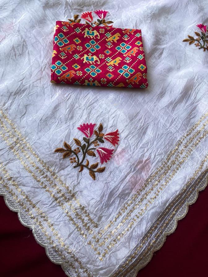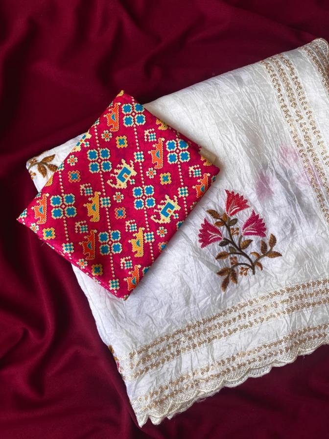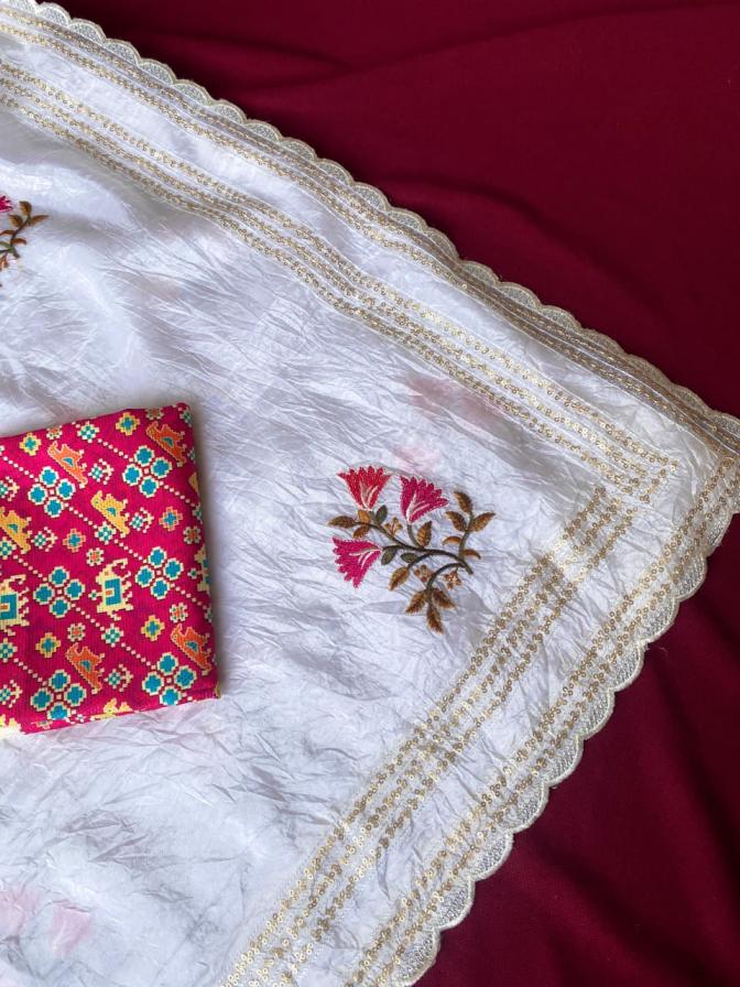 Catalog : 1022 👉🏻🥻 Premium crush organza Saree with self sequins weaving pattern all over the Saree with scallop Border Blouse:- contrast patola prints blouse Rate:-1350/-🤩🤩 Ready to ship 🚢🚢🚢 |