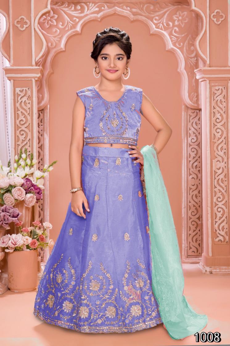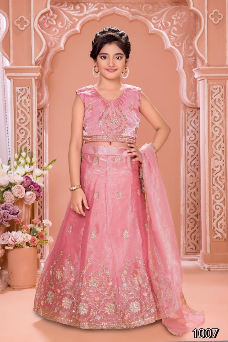 aarvi vol 1 full stitch organza silk moti kardana kids lehengas