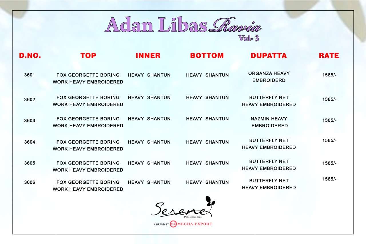adan libas ravia vol 3 by megha exportes georgette work special pakistani suits
