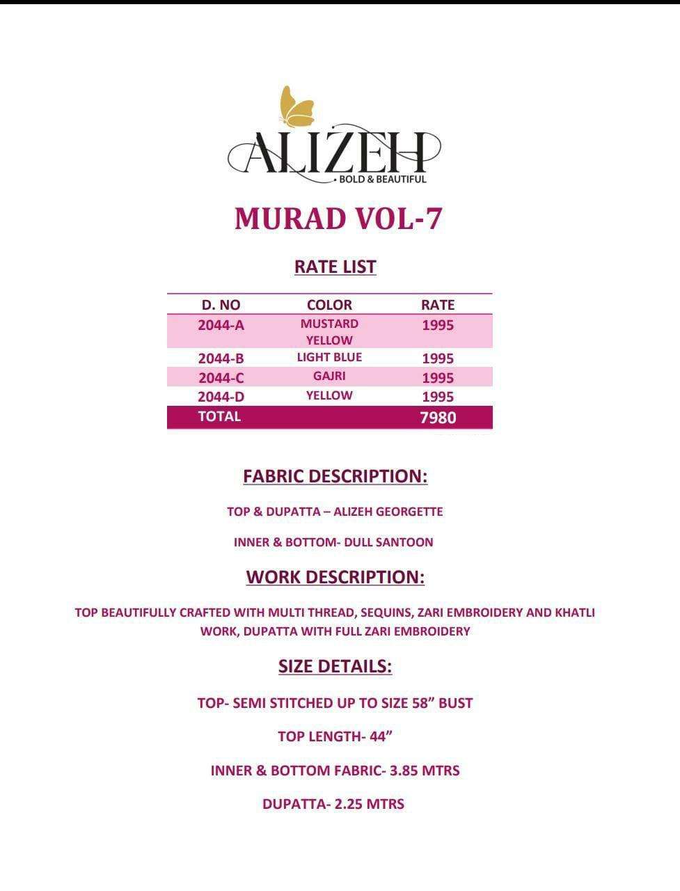 ALIZEH OFFICIAL MURAD VOL - 7 Bringing Elegant And Fashionable Collection With New Design And Elegant Colors To Rock Your Festivals And Weddings!! Embroidered With Multi Thread And Sequins Work Along With Khatli Work. Bust - 58 INCHES Delivery-Ready To Ship Book Your Orders Now! |
