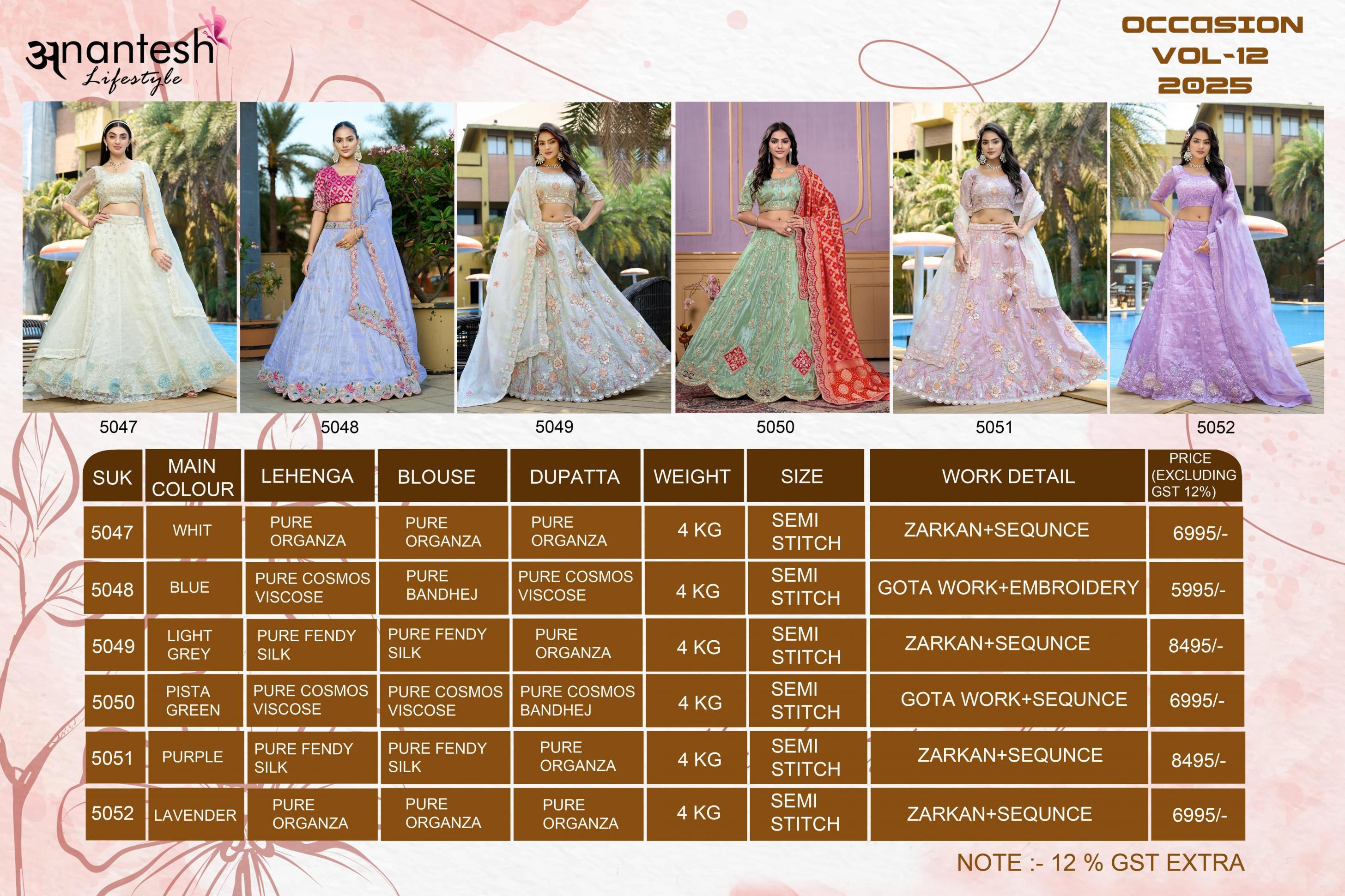 ANANTESH ®️ LIFESTYLE PRESENTS OCCASIONS VOL 12 SERIES 5047 TO 5052 STUNNING LEHENGAS FOR SPECIAL OCCASIONS Conceptually designed for Engagement, Wedding, Sliders, Pre-Wedding Parties, and Bridemaids, our Occasions Vol 12 series is a must-have for any special occasion! - Perfect for making a statement at any occasion - Semi-stitch only available - Single pieces and full catalogue available - Please find the attached rate card and fabric details for more information - GST 12% tax extra ORDER NOW