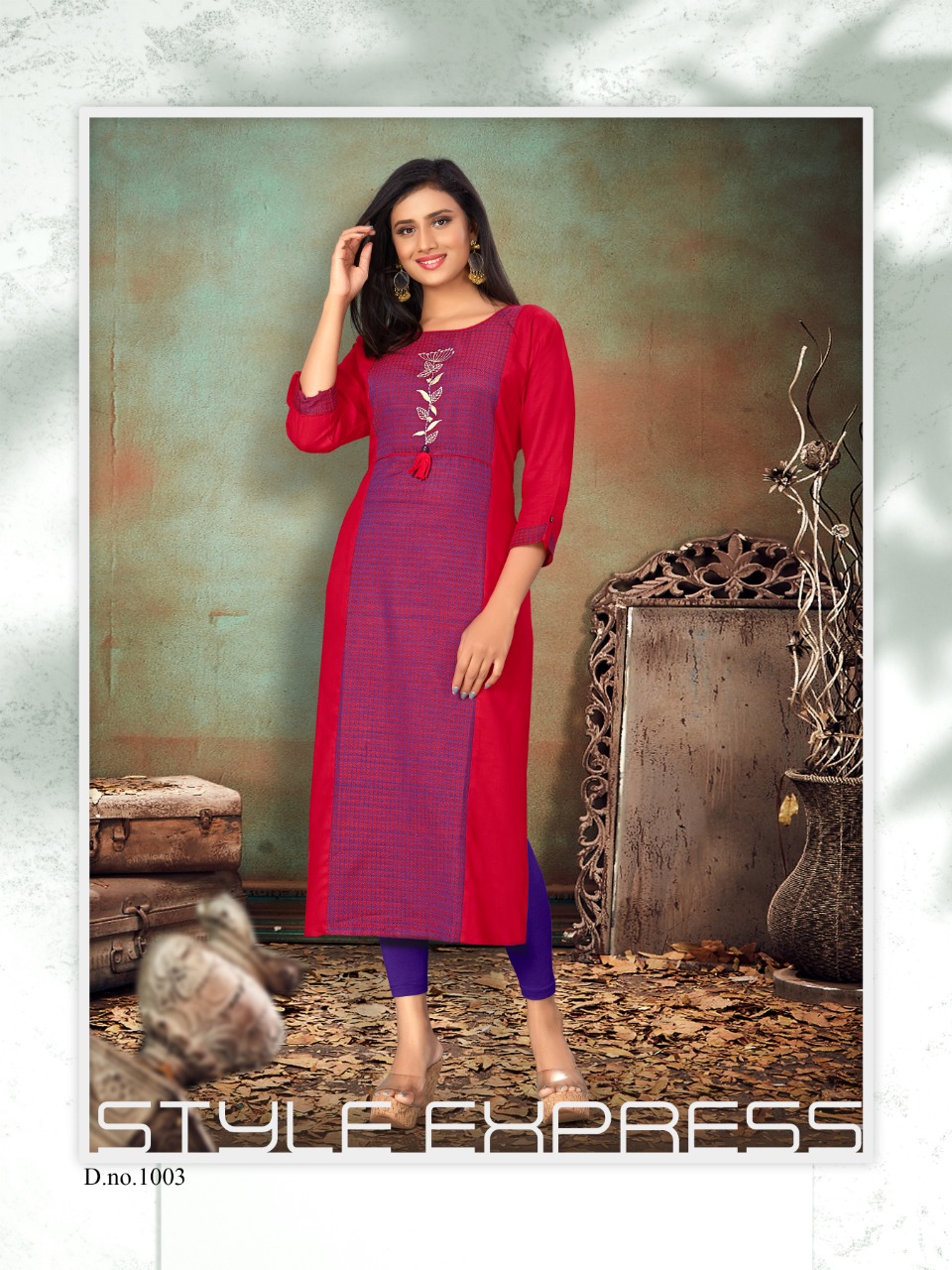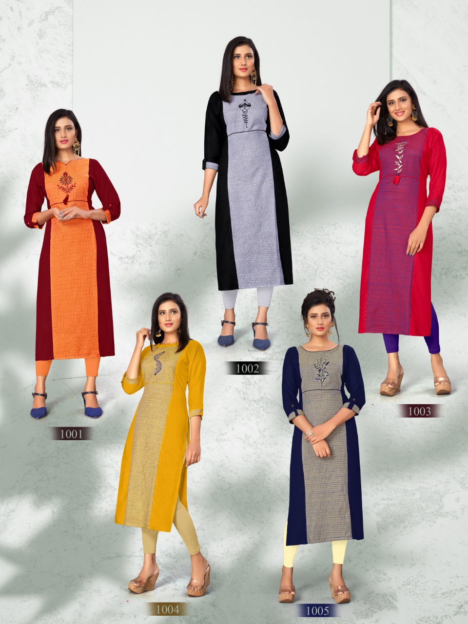 Catalogue name - angel Details 👗Fabrics - 1. kurti-- premium rayon slub fabric + self weave panel + embroidery work 🎗Size - M(38) L(40) XL(42) XXL(44) Designs - 5 pcs ₹ Rate : 3⃣6⃣5⃣only per pcs . Set to set. GST 5 Percent Extra. Delivery from today |