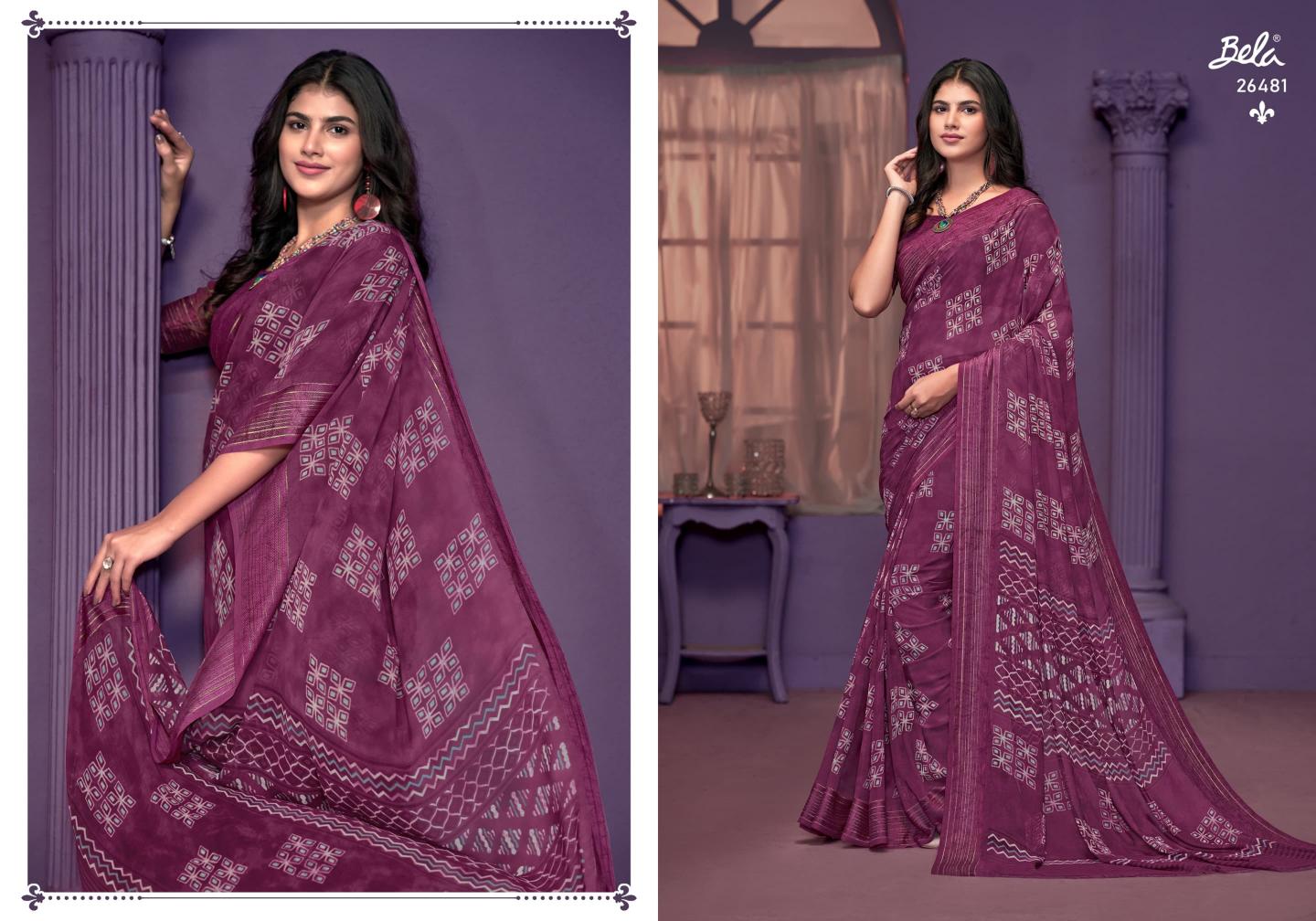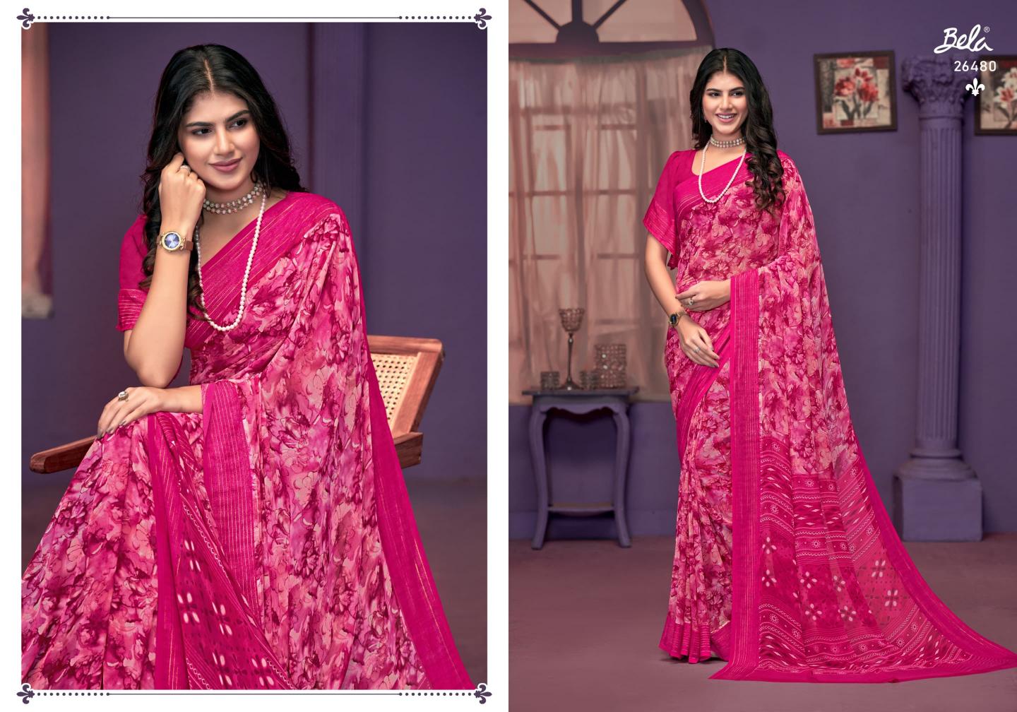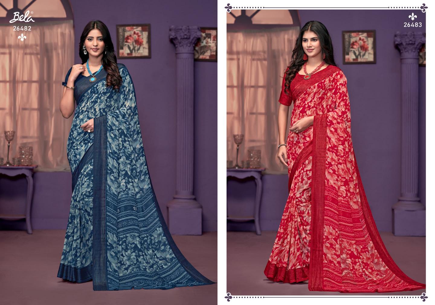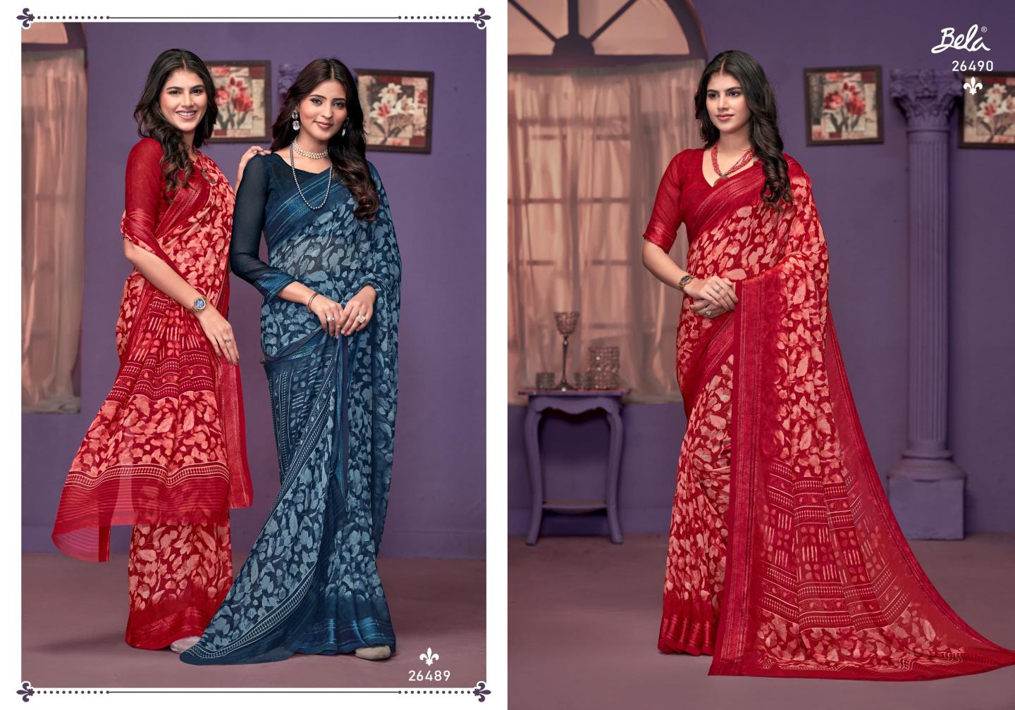 Bela Sarees Skyla - 3 Fabric : wtless and Georjet with weaving border printed sarees Rate :- 665/- Pcs :- 16 Set To Set |