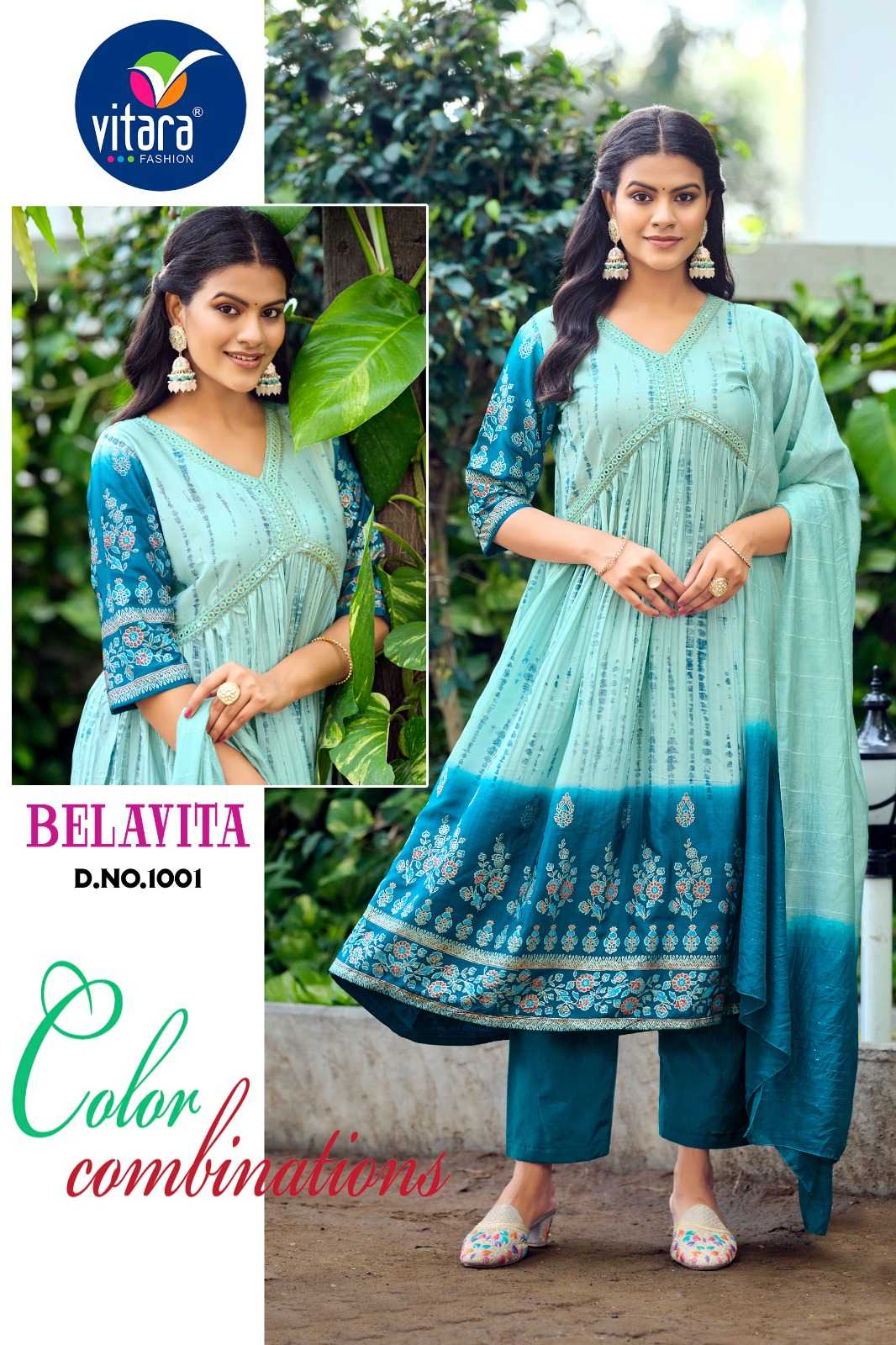 Vitara fashion launched pic & choose 3pcs Combo set Name - belavita fabric🎀 *TOP- heavy crape silk with print 🏵️*Bottam-**- dyable dhupian 🌻dupatta- viscos with secquence 💥size -m to 2xl 🌟design-1 RATE 955/- |
