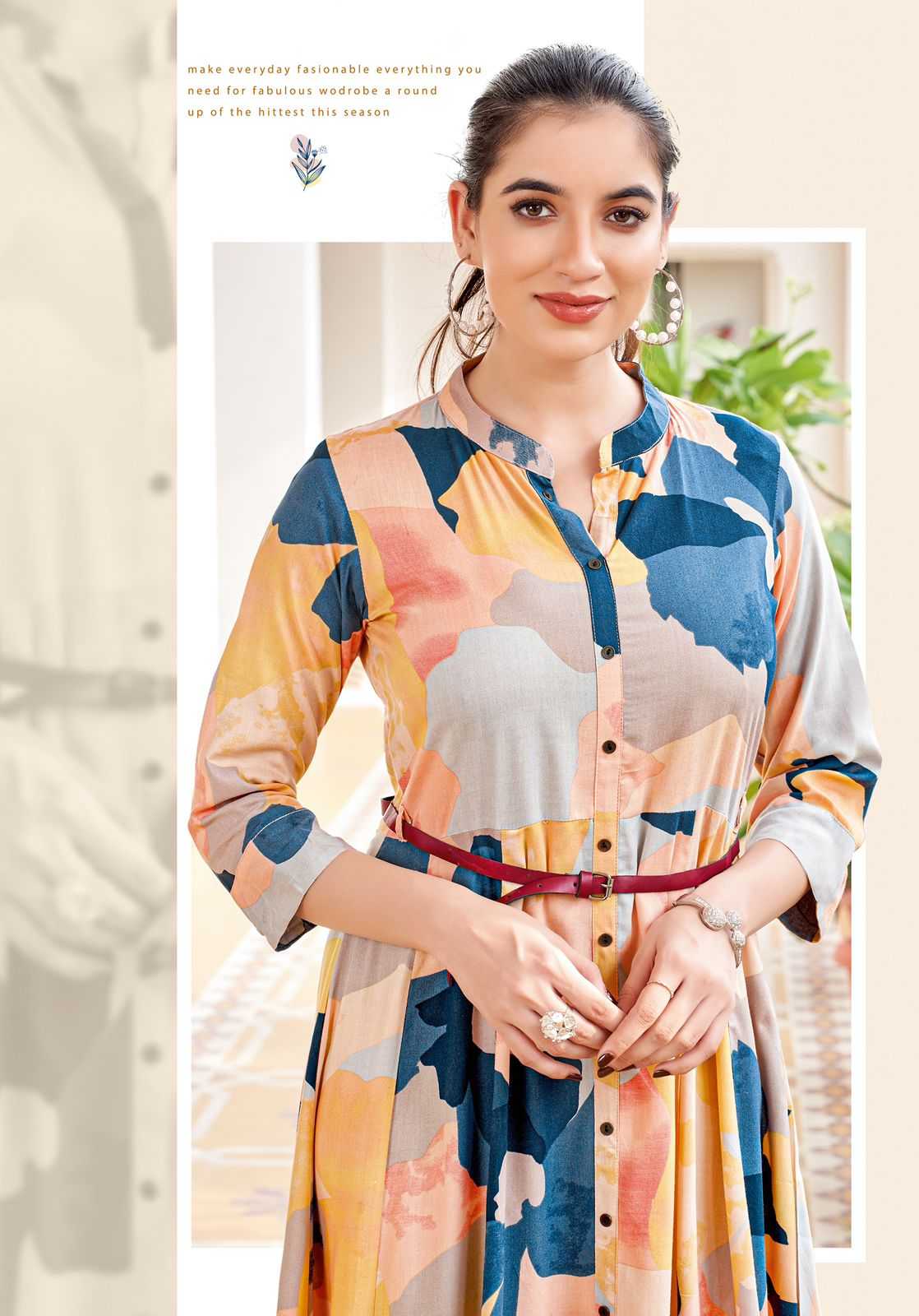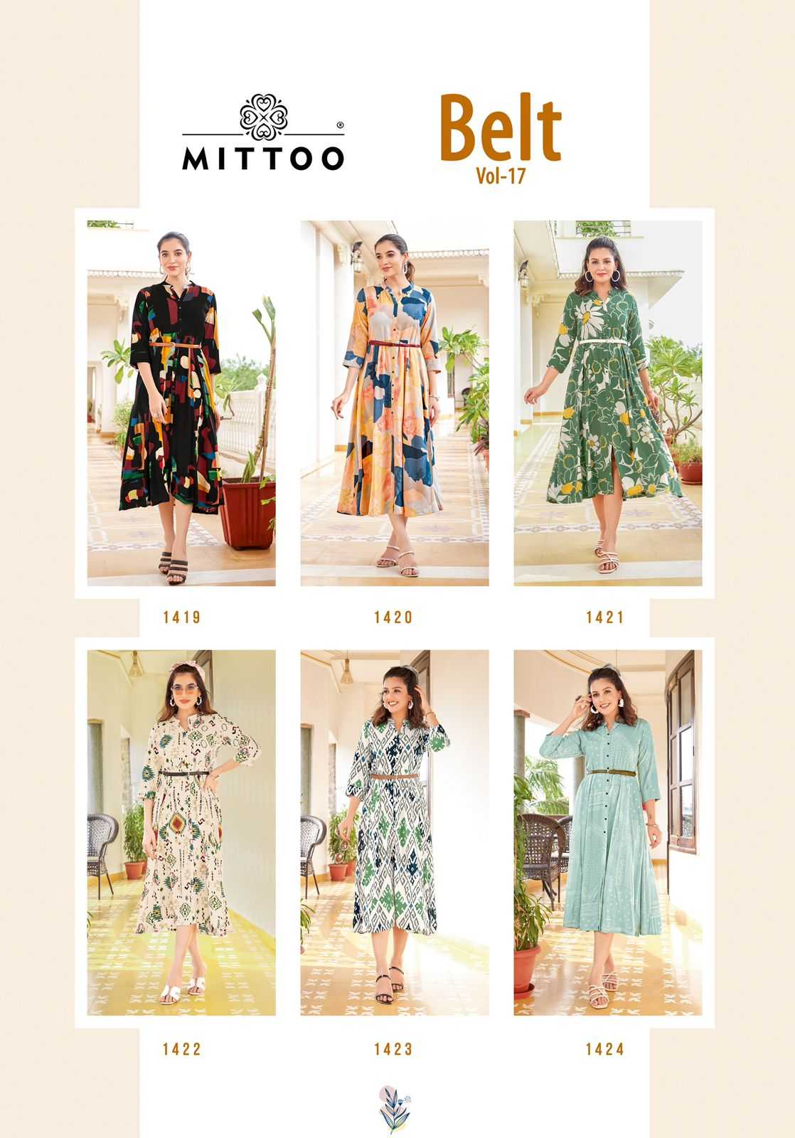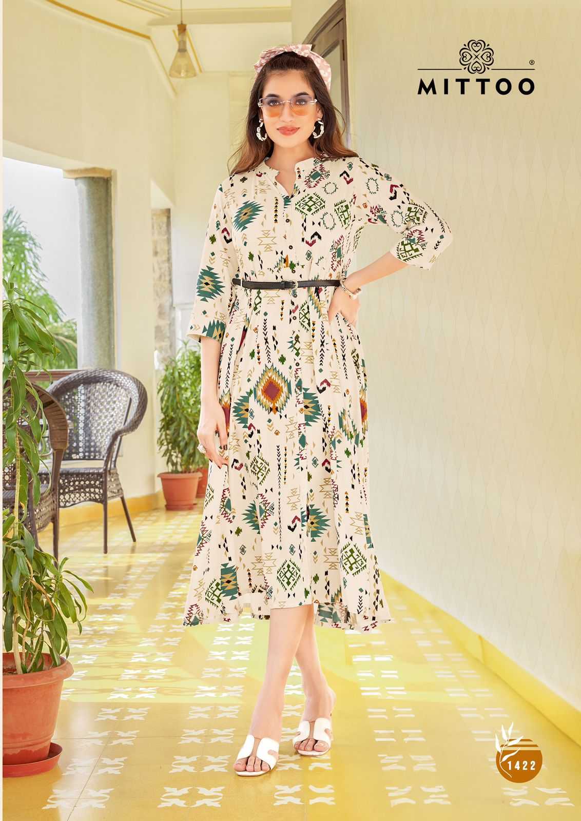 belt vol 17 by mitto rayon print readymade flair long kurti with belt