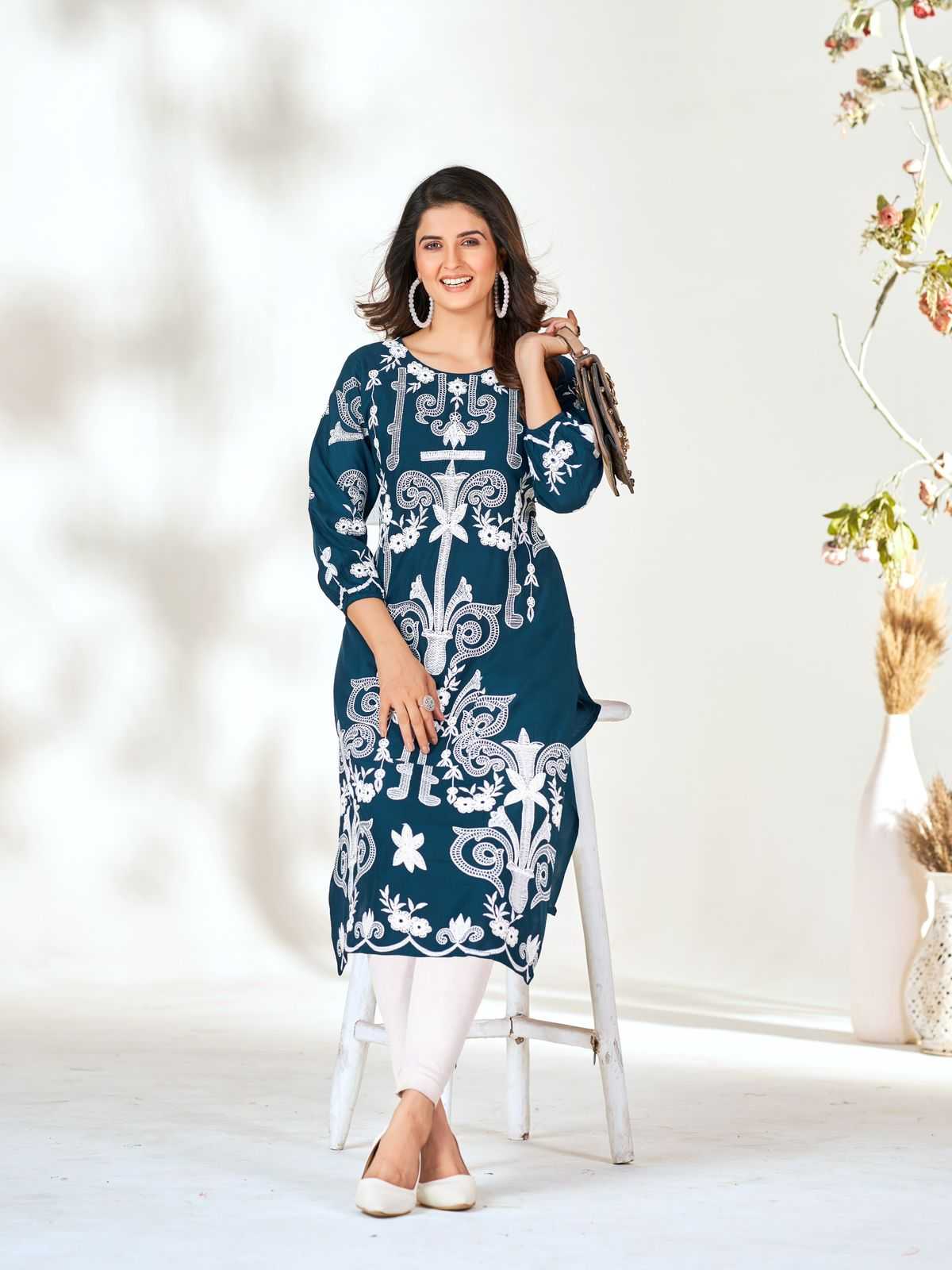 Blue hills Wear this summer trending outfit Fabric rayon 14 kg Balloon Sleeves look with work Side cut Length- 44 Size - M(38)L (40) XL(42) XXL(44) 3xl(46) 4xl(48) 5xl(50) 6 Colors Rate - 545 + 5 %GST |