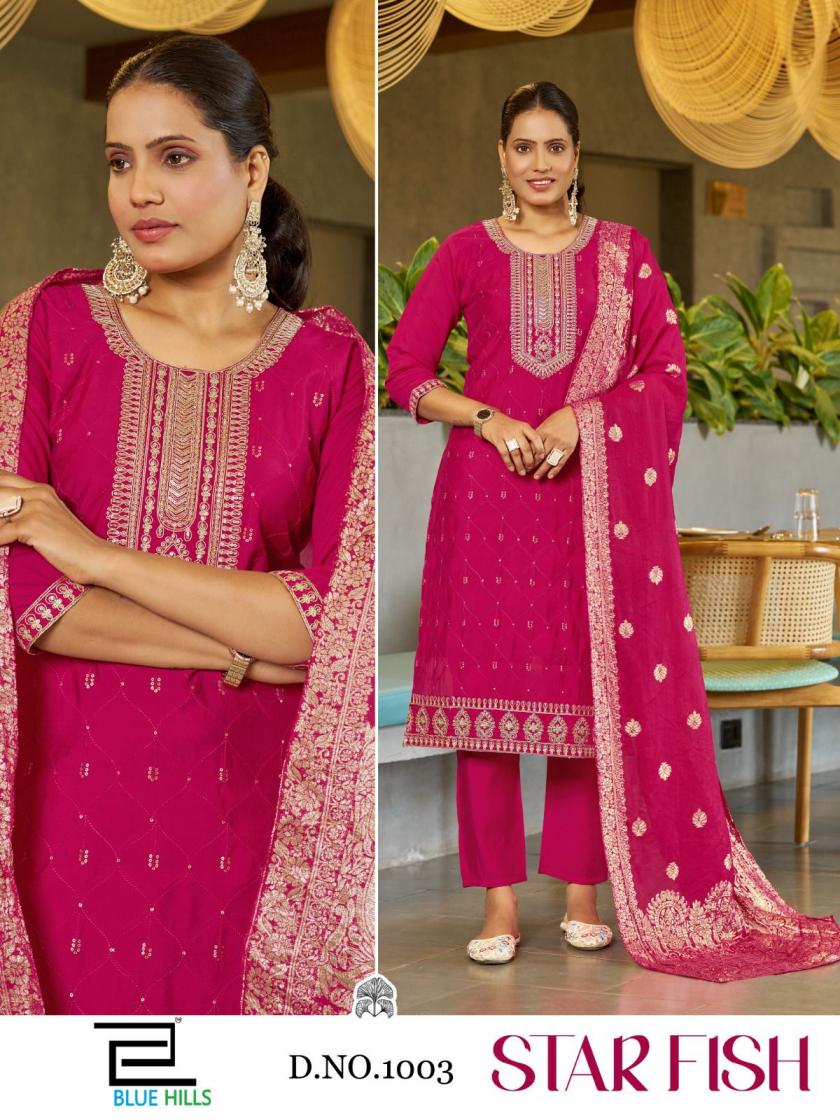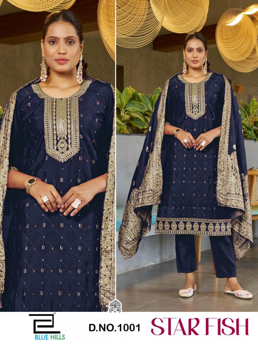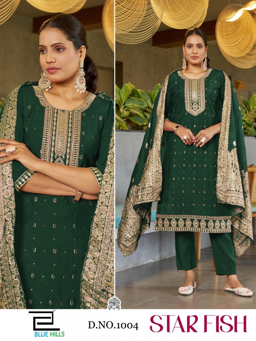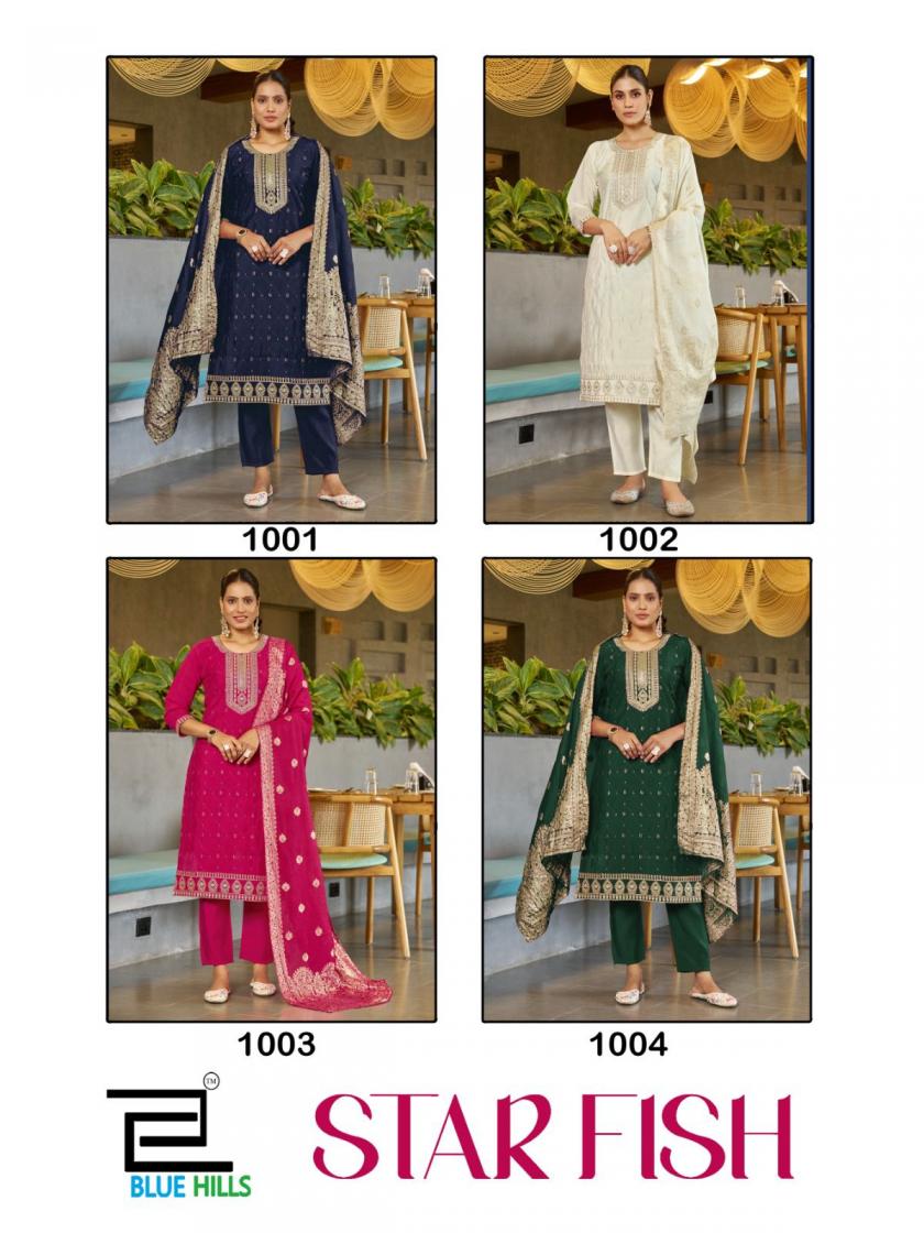 #BLUE HILLS We are introducing OUR new catalog 📕Catalogue:- Star Fish Concept:- 3pcs 👗CLOTH:- Roman Silk Dupatta:- Jacquard Silk ✅ Embroidery Style:- Dori work With Self Color Thread & Sequence Work Size:- M L XL XXL 3XL 4XL 5XL Rate - 970/- +GST 4 Color CATALOGUE 🚛 : Dispatch : 2 to 3 days |