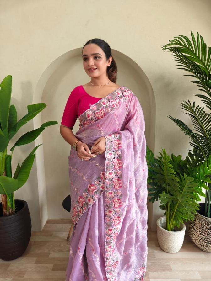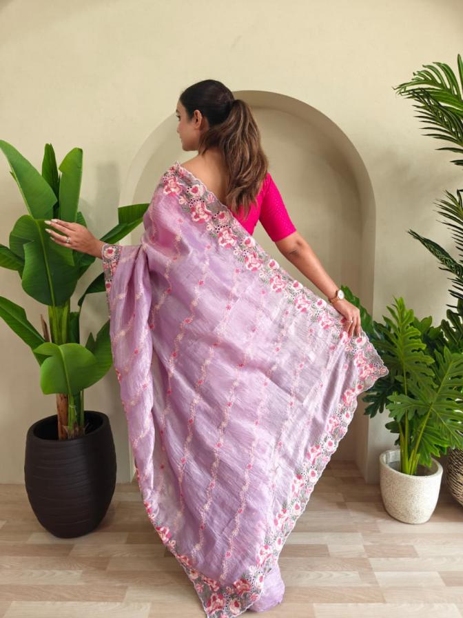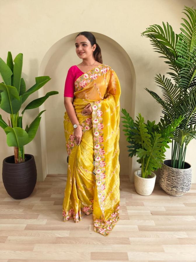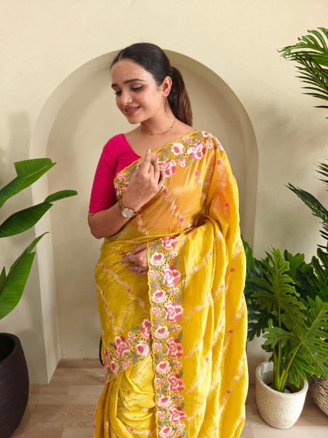 Premium collection saree. Catalogue - Chitra 🥻👉🏻Description - Pure crush silk saree with all over Leheriya embroidery design and cut work design. 👉🏻 Highlight - Intricate embroidery designed contrast pallu. 😍 👉🏻 1350 Ready to ship 🚢🚢🚢 |