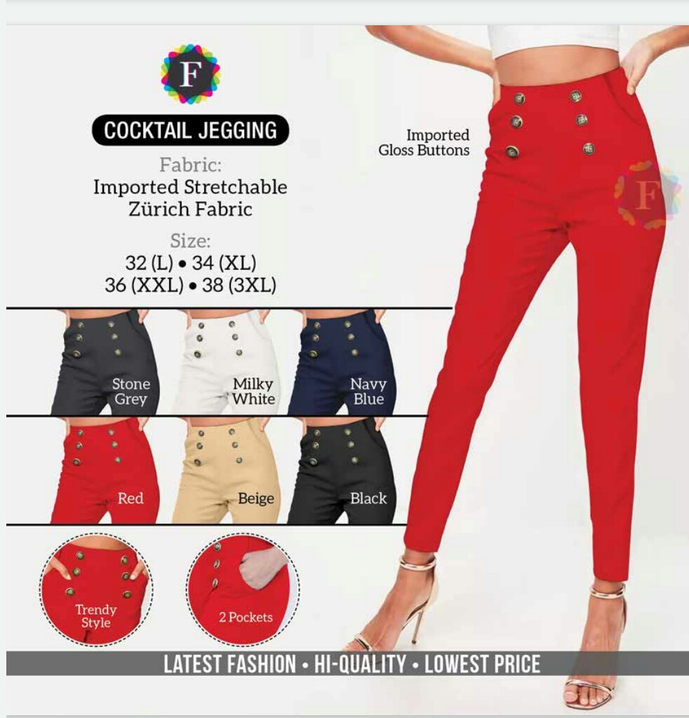 COCKTAIL JEGGING Imported Stretchable Zürich Fabric 2 Pockets USP: Imported Gloss Button Sizes: 32 (L) • 34 (XL) 36 (2XL) • 38 (3XL) Available in 6 colours wholesale price ₹475/- GST 5% EXTRA Limited Stock Happy Selling |