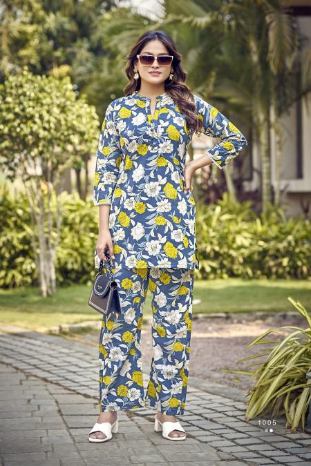 👏🏻👏🏻 Catalouge : 💃 COTTON BEATS 💃 CO-ORD SET COLLECTION Fabric in Top : Cotton Print 60*60 Sleeves type : 3/4th Rate : 525/- + GST 5%