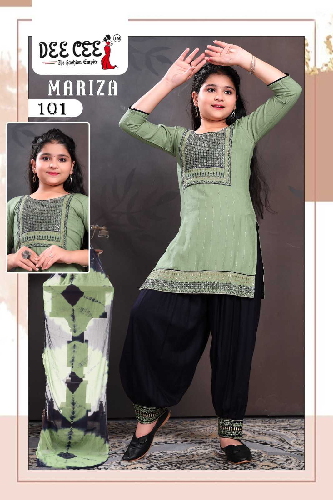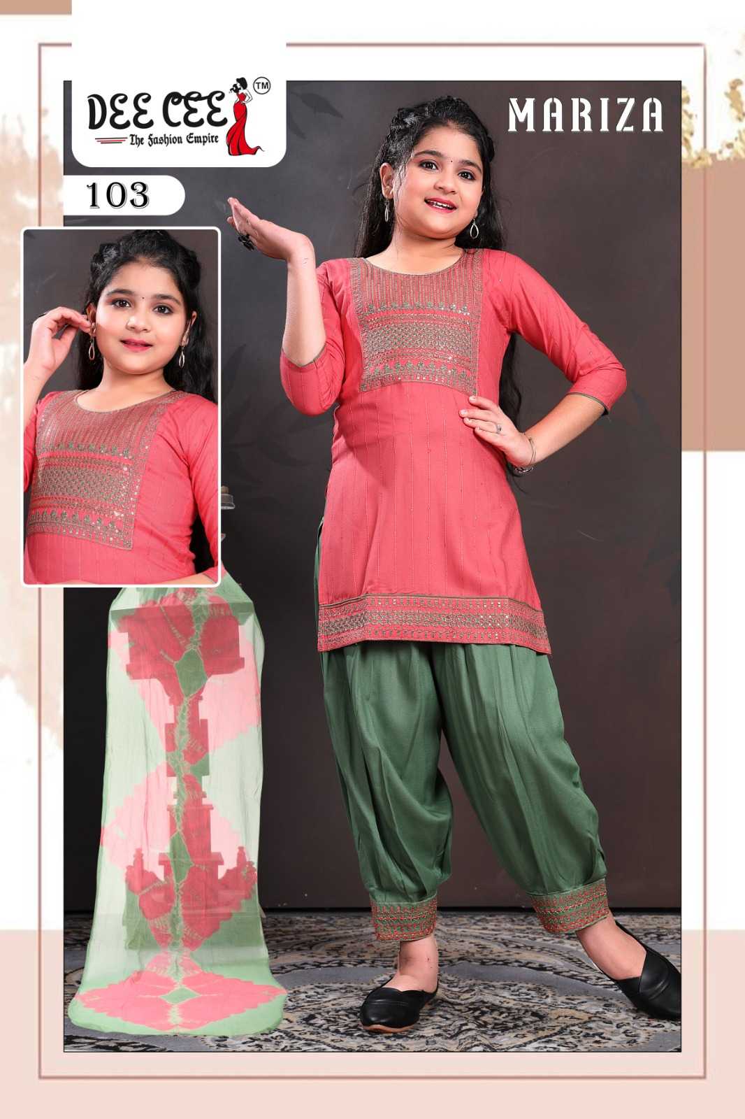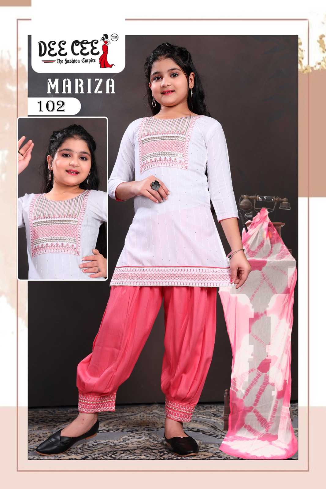 dee cee mariza fancy readymade a line kurti with bottom and nazneen dupatta girls wear combo set