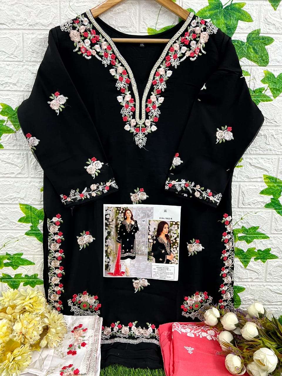 Top :- Fox georget embroidery with khatli santoon inner Bottom :- cotton STRETCHABLE pant with Side pocket & BOTTOM patch COMPLETELY READY TO WEAR Dupatt :- Nazneen Dupatta with embroidery With lace satin Size Chart Top size chest :- XL. (42) Bottom LENGTH:- 38” Inches + Rate :- 1175 + GST |
