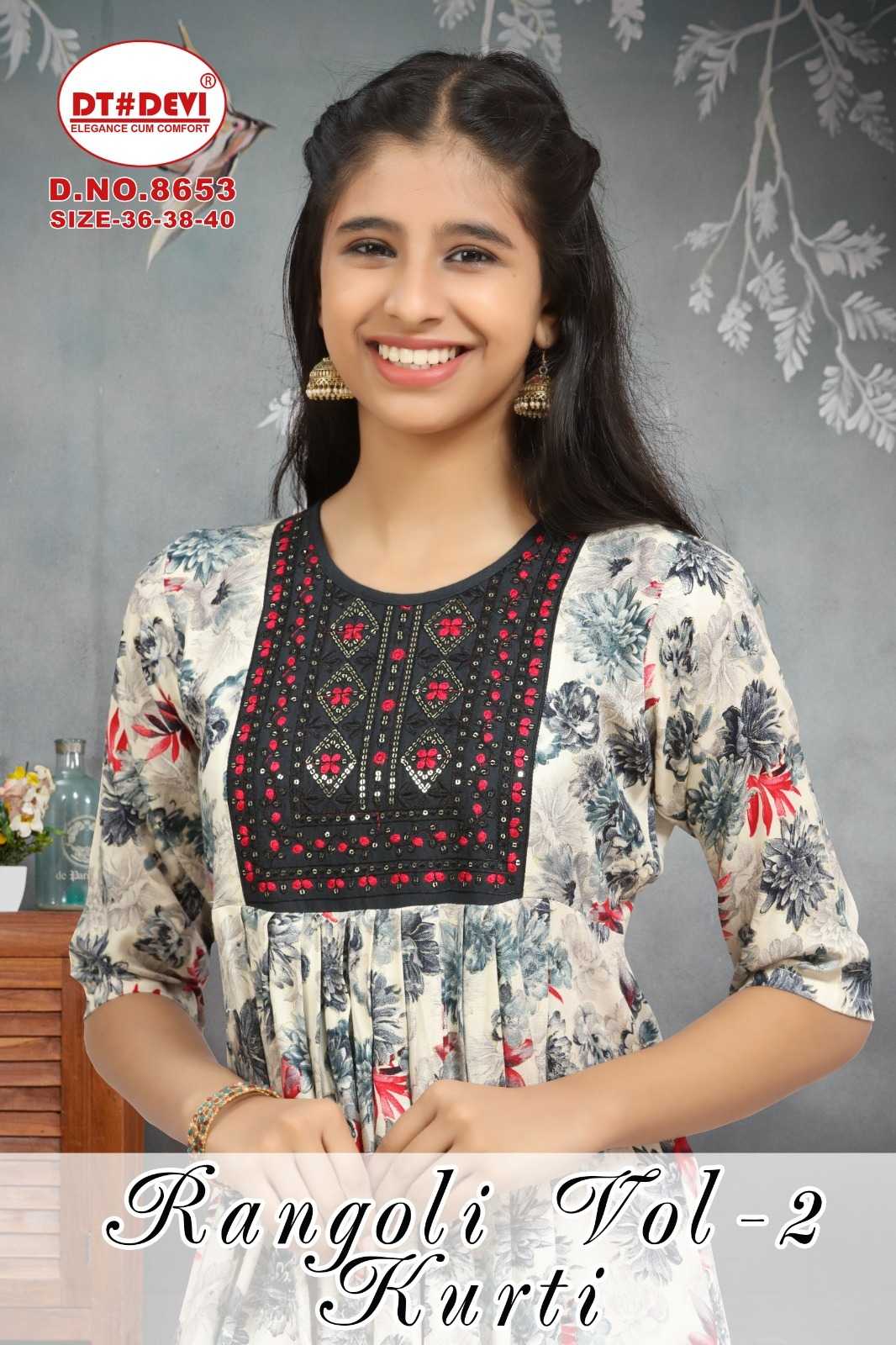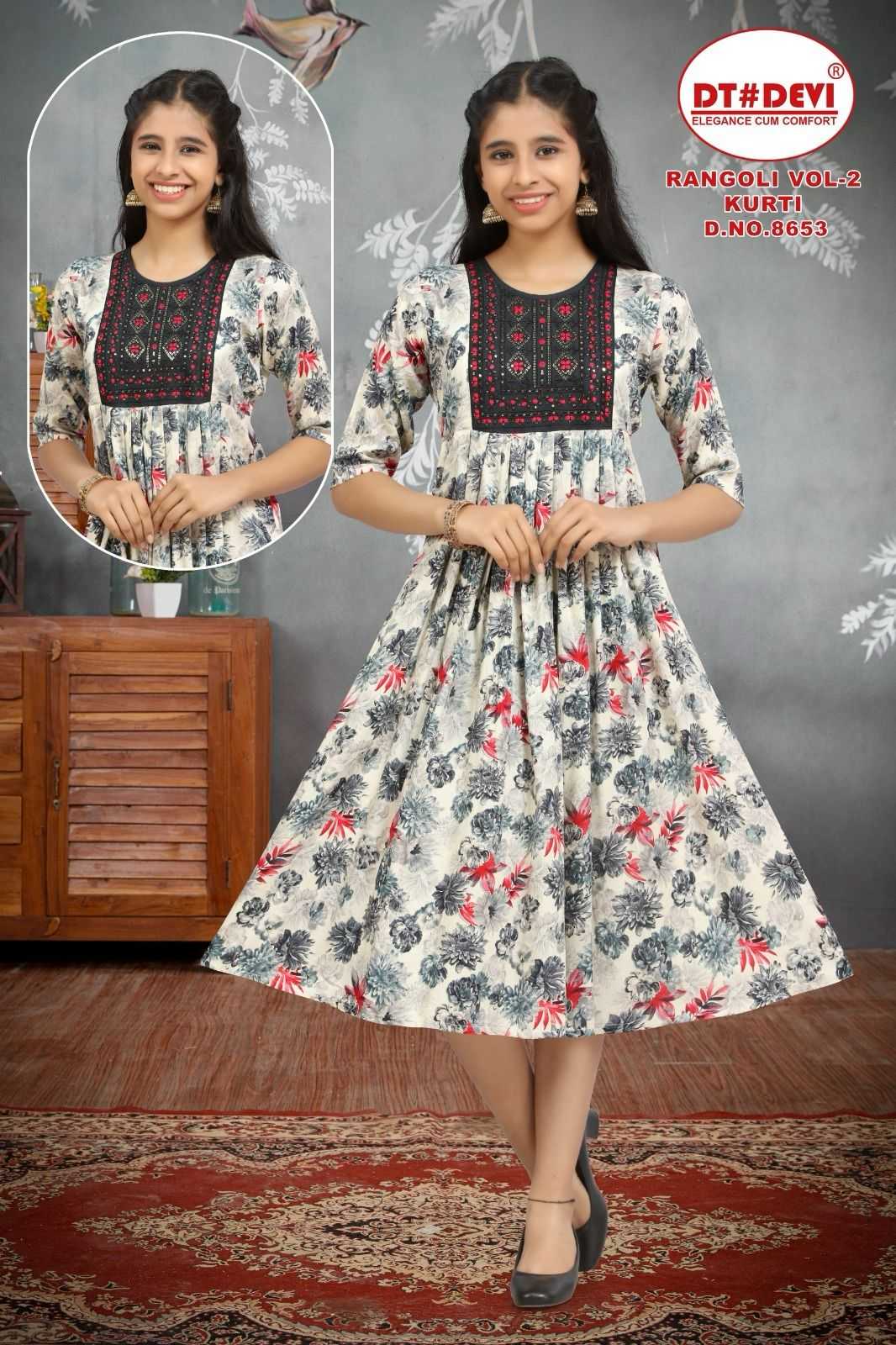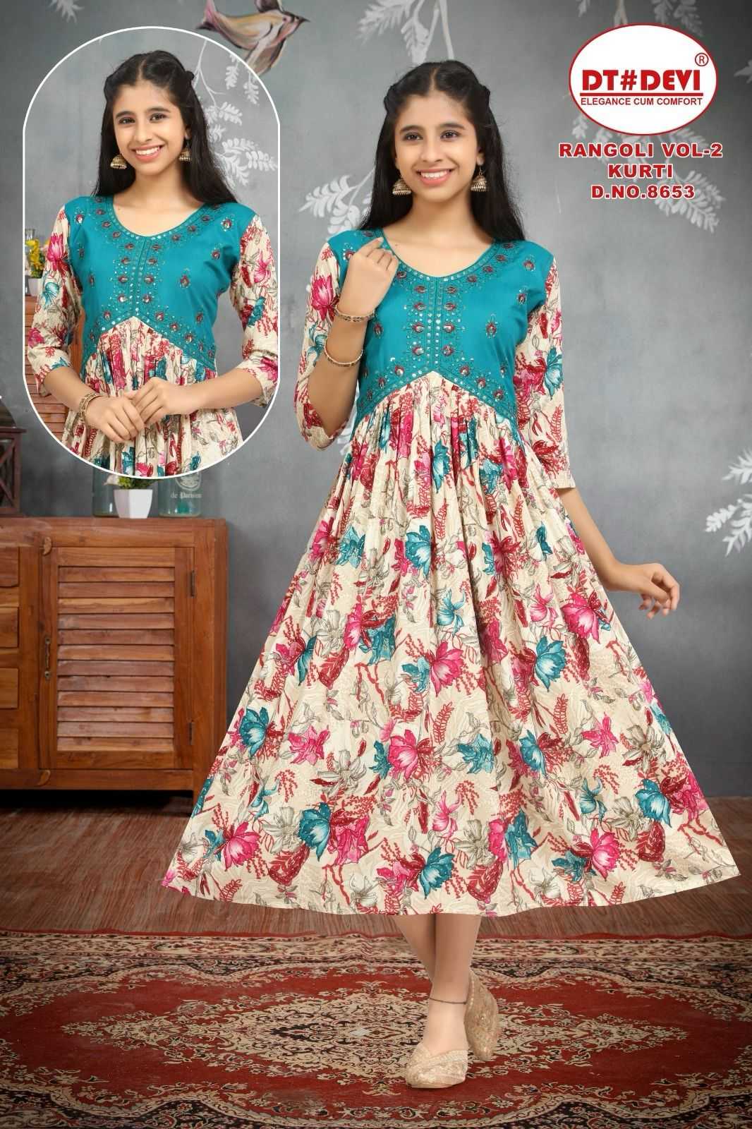 dt devi rangoli vol 2 8653 rayon print readymade sequence work combo kids kurti