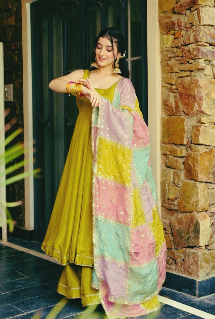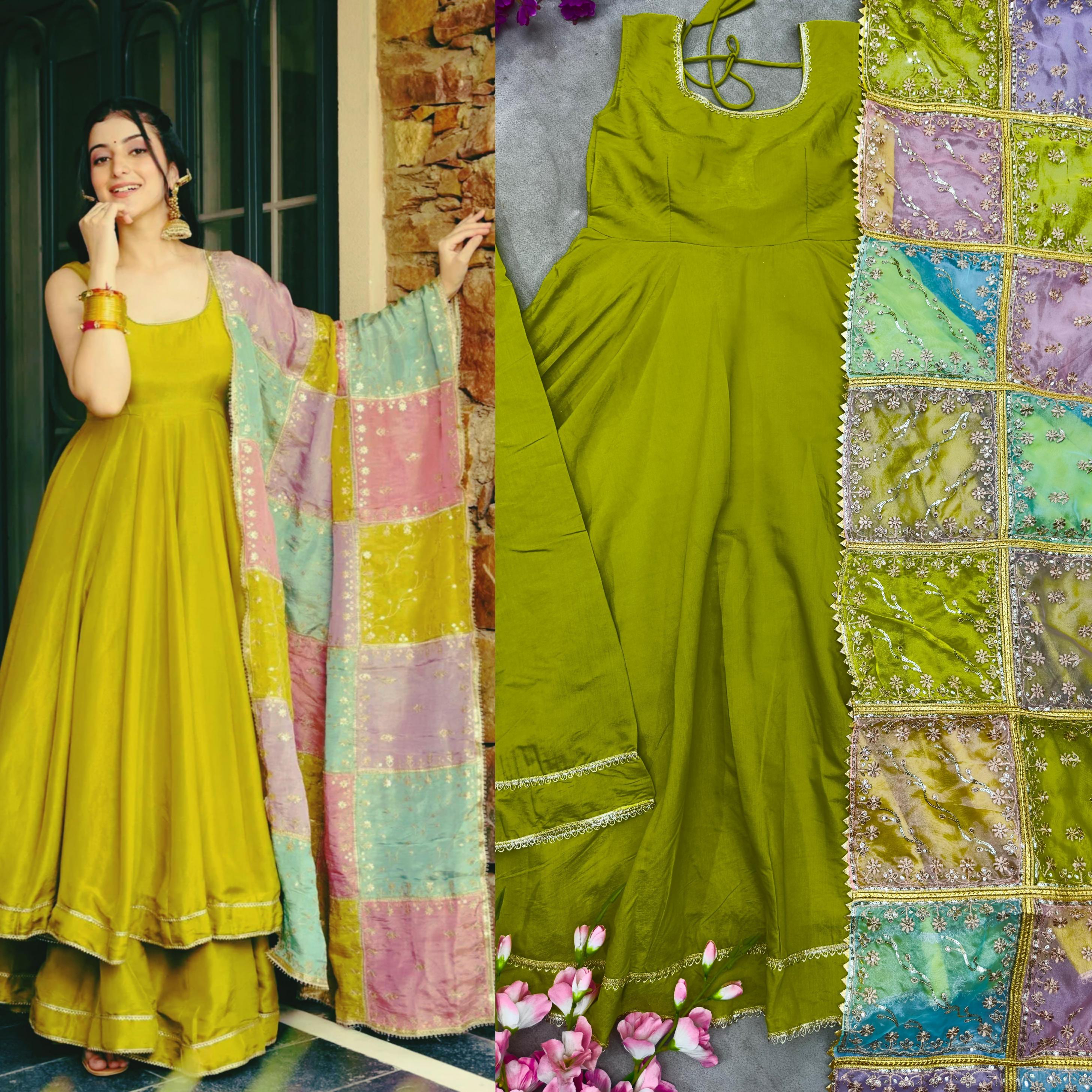 “Elegance meets tradition — Mehndi colour paired with a beautifully embroidered multi-tone dupatta, perfect for festive celebrations or a graceful evening affair.” DN: DVD ON 5137 👗TOP (Note: SLEEVE FABRIC GIVE IN SAPARATE) 👖Plazo Fabric :- ROMAN SIMMER SILK GOTA LACE BORDER 👗Dupata Fabric : ORGENZA SILK Length : 2.40MTR Weight :- 1KG,100GMS Price:- 1495/- ❤️PREMIUM AND SHOWROOM COLLECTION |