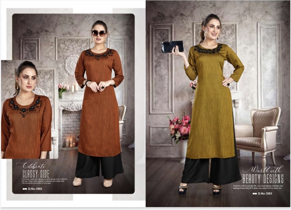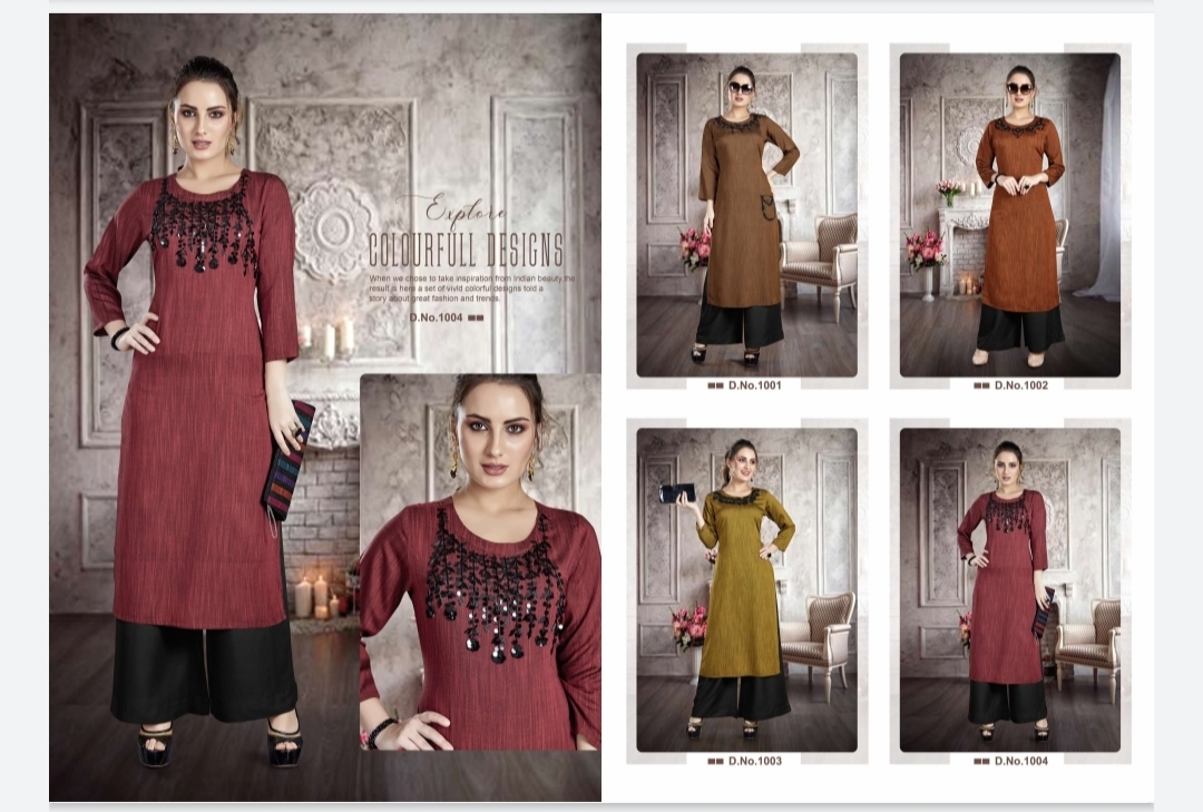 Surat CHANNEL 9 presents F A R A Z A N A 💁♀ SELF ESTEEMED Description : *RAYONE BASE YARN DYED FANCY HANDWORK * No.of designs : 4 Available Sizes : L40, XL42,XXL44 Without Plaazo Rate:-525+GST With Plaazo Rate:-725+GST Please send your orders. and feel free to talk.... made in india |
