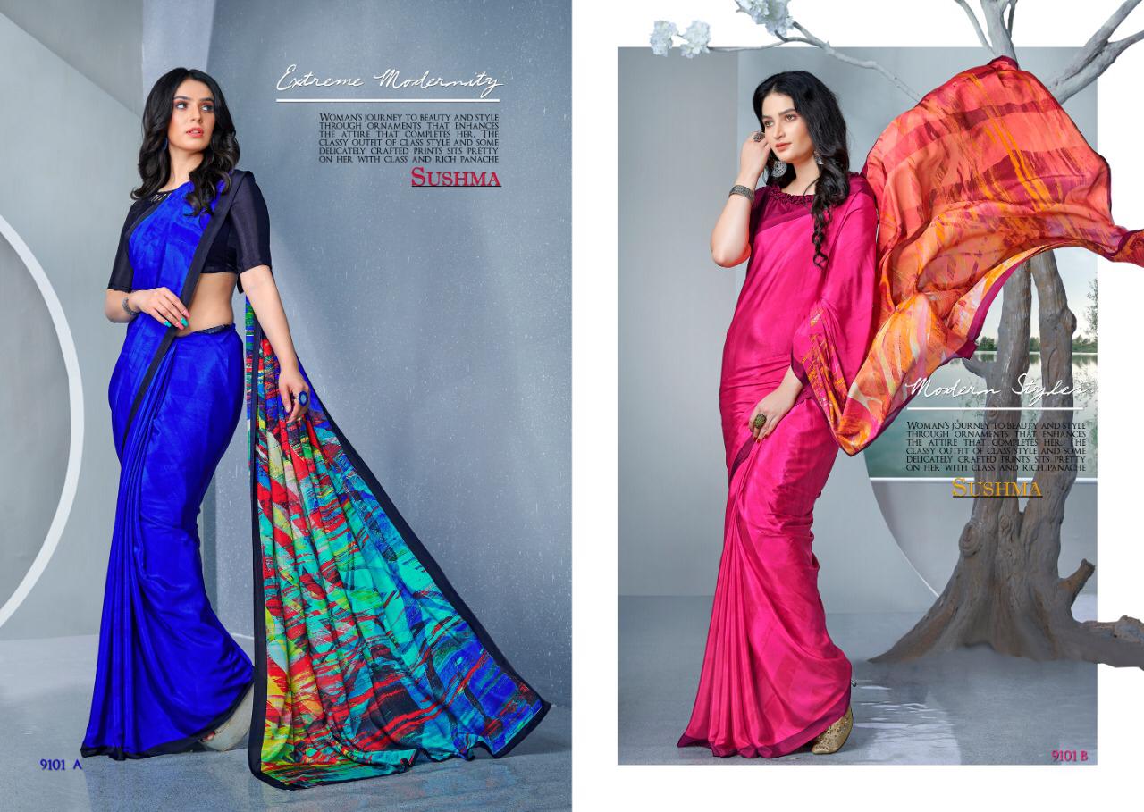 (9101 SERIES) by Sushma STYLE CRAPE 590/- 18 SAREES Set to set . GSt 5 Percent Extra. Delivery from today |