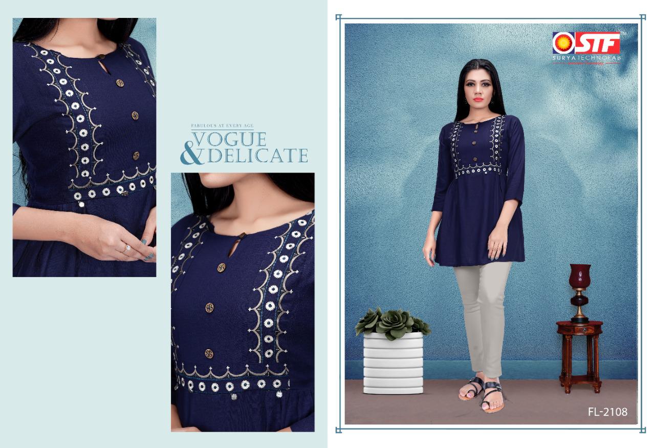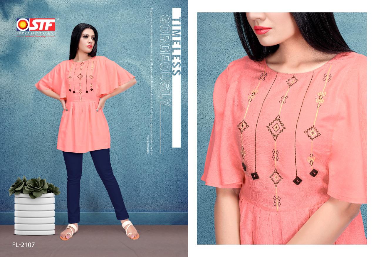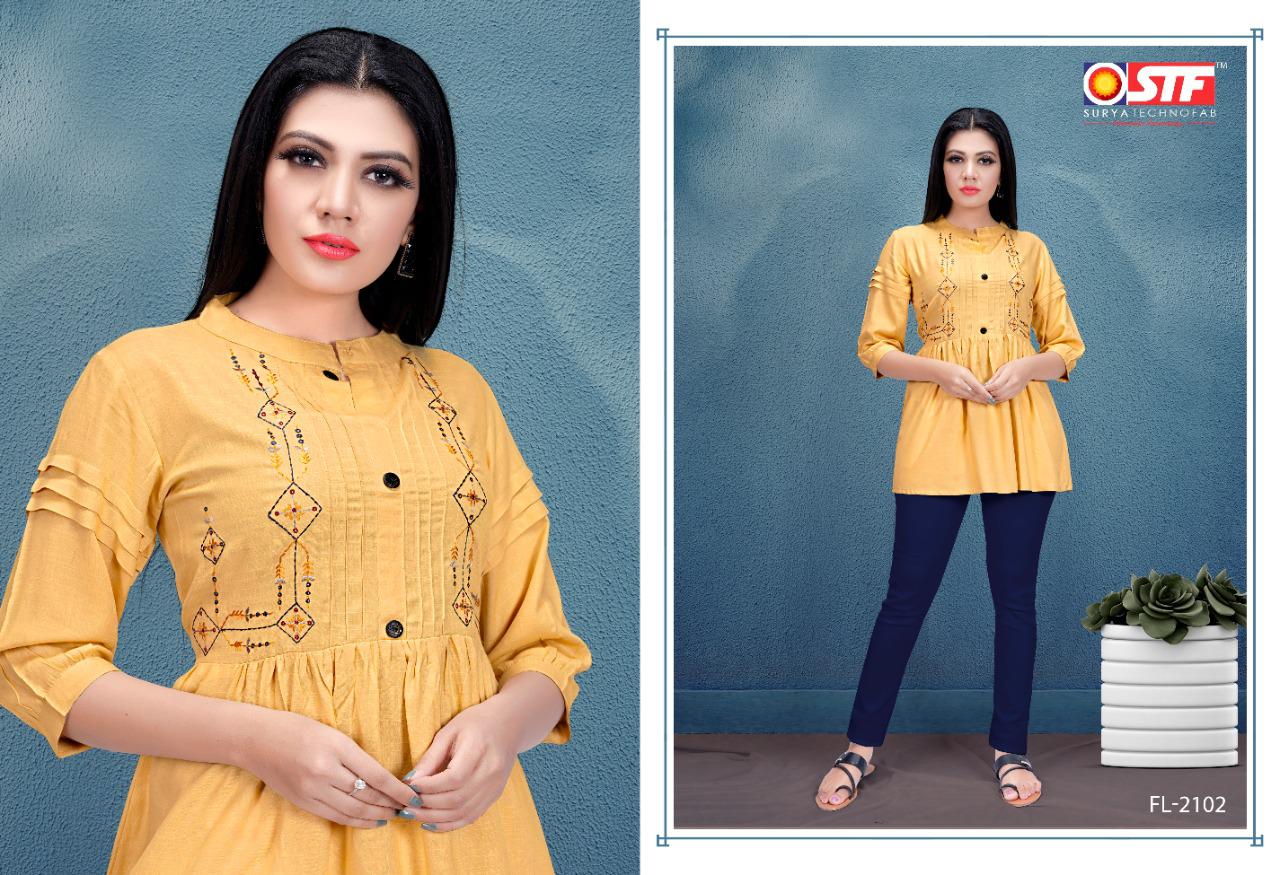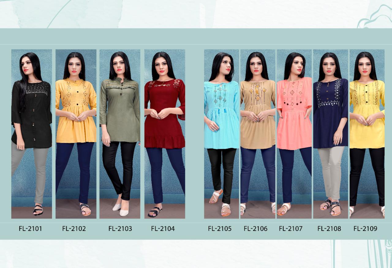 SURAT STF - Kurties Launches A Collection of 9 Rich Styles & Vivid Colours of Trendy Short-Tops Catalogue :- Florence (Vol-21) _(Stylish Embroidered Short Tops)_ Fabrics :- * Hi-Quality Rayon Slub * Length :- * 30”-32”* Flare :- As Per Design Bag :- 9 Pieces Sizes :- M - 38; L - 40; XL - 42; 2XL - 44 Price :- ₹460/- plus 5% GST _Delivery - Today |
