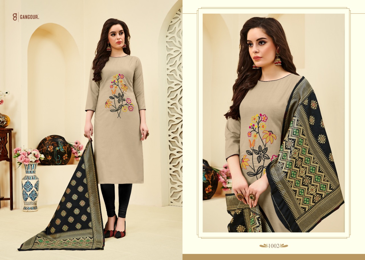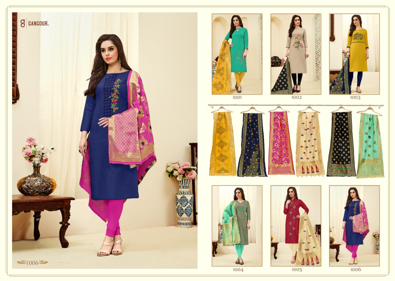 Now presenting ➖Gangour Catlog----- Femina -----Fabrics---- Top - Cotton slub Bottam- cottan. Duptta - Banaras dupta Rate---------- 595 Des------------0⃣6⃣pcs only Monday despitch Confirm ur order as soon as possible |