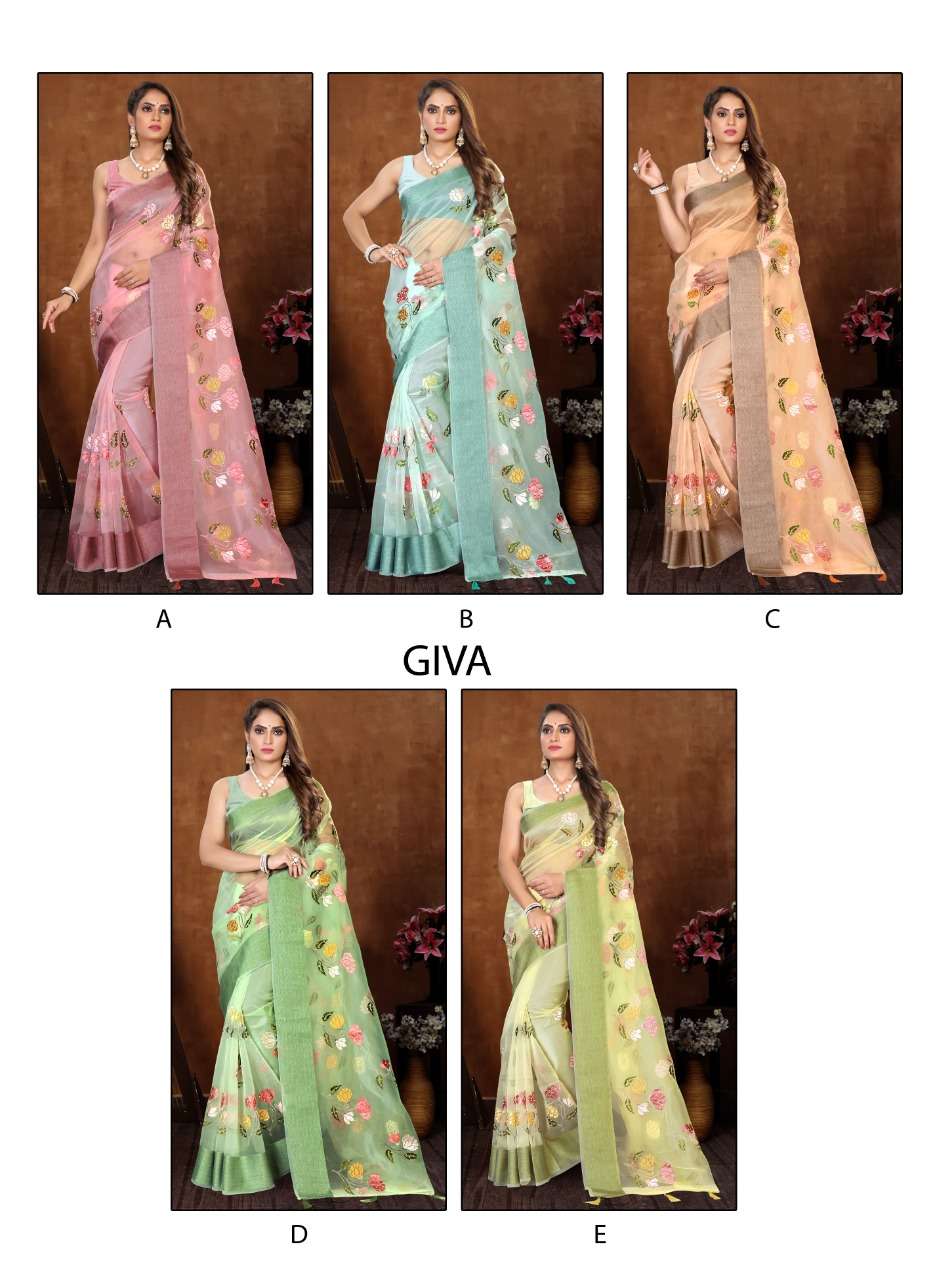 Dear Customer, We are launching our new Saree Catalog Brand – Ranjna Sarees Catalog Name : GIVA Fabrics – ORGANZA Cut - 6.30 Mtr * Set to set * Rate -1195/- Pc – 05 GST 5 Percent Extra. Book your order now |