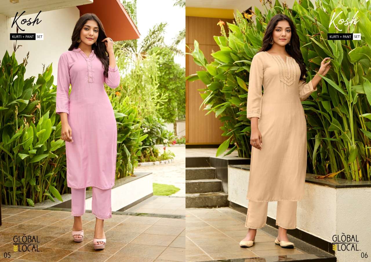 Catalog : KOSH Style : Kurti + Pant Combo set BRAND : GLOBAL LOCAL⢠TYPE :  Soft Muslin kurtis with lace detailing with muslin pants SIZES : S to 3XL(Rs 10/- extra for size 3XL) RATE : 505/-(Kurti with pants) Pieces:  6 per Bag |