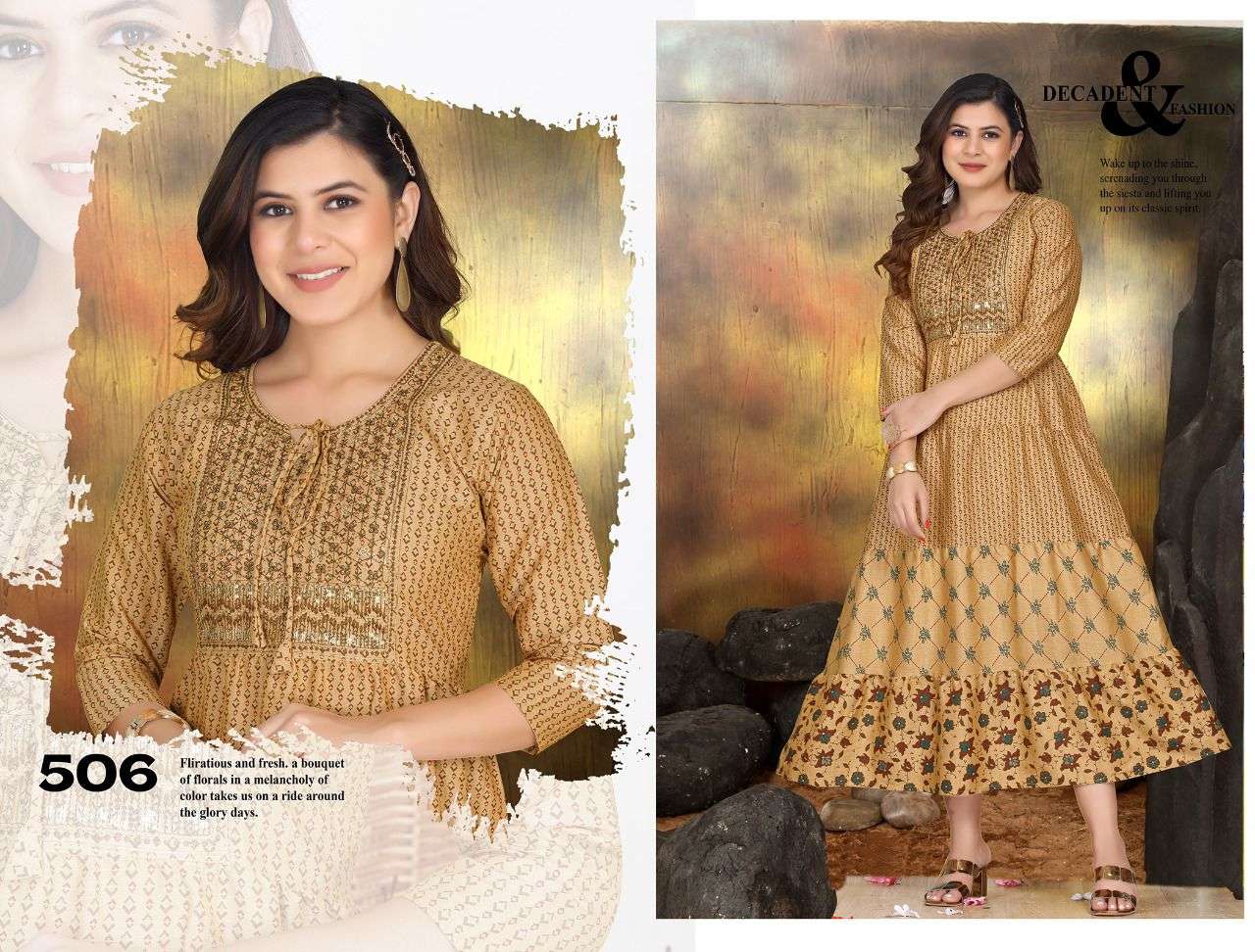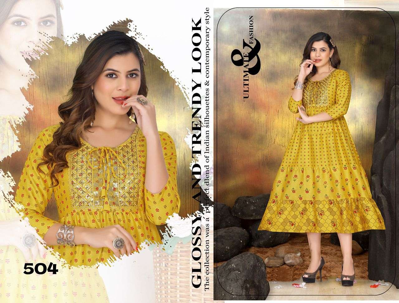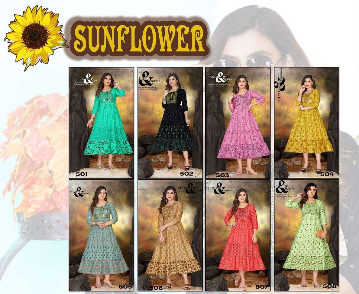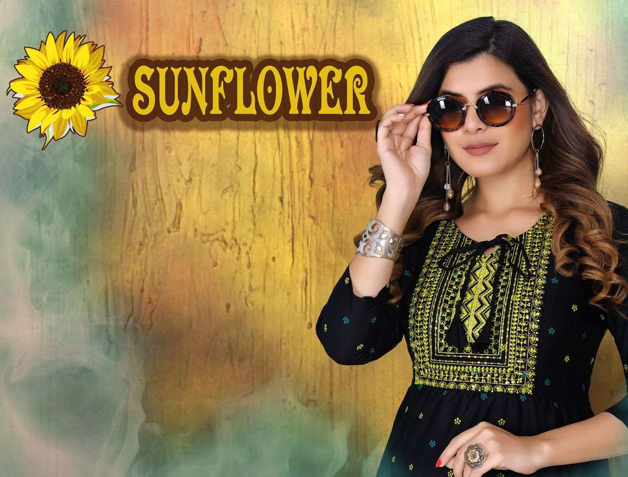 GOLDEN SUNFLOWER TWO TONE RAYON 14KG FOIL PRINT KURTI CATALOG WHOLESLAER BEST RATE