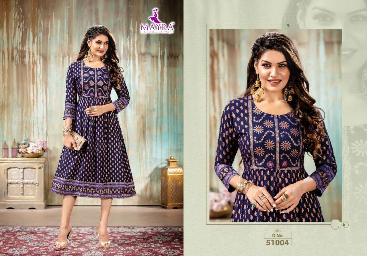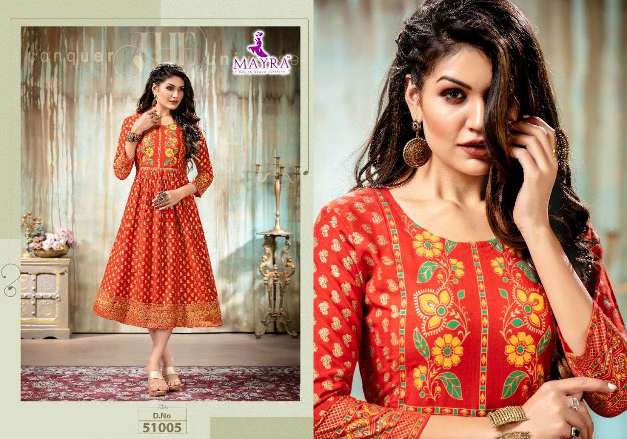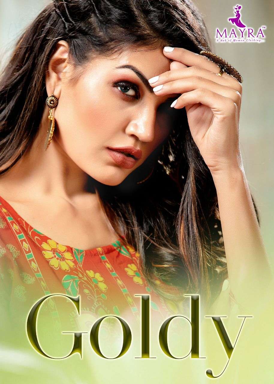 GOLDYY BY MAYRA HEAVY RAYON SLUB WITH GOLD FOIL PRINT KURTI CATALOG COLLECTION WHOLESALER BEST RATE IN SURAT