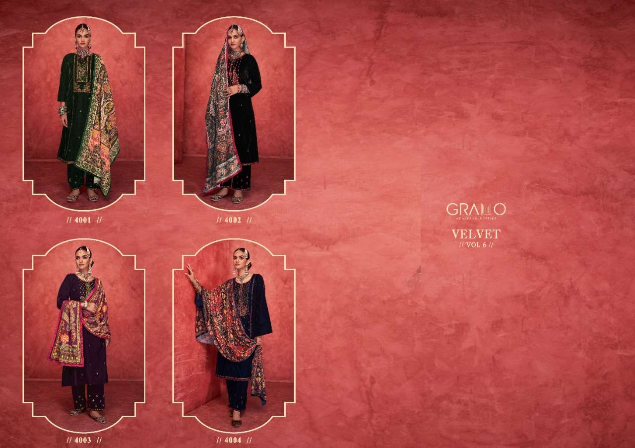 Gramo®️ ❤️ Velvet vol 6 ❤️(4 PCS) Being all new hue to your festive Wardrobe. An elite look to be carried for the fanciest colours of the season. Glam up your festive look with 4 Piece Set Of 4 Designs. FABRIC 👗 - Top hevy Velvet nine thausand with inar Rate 1750 /- |