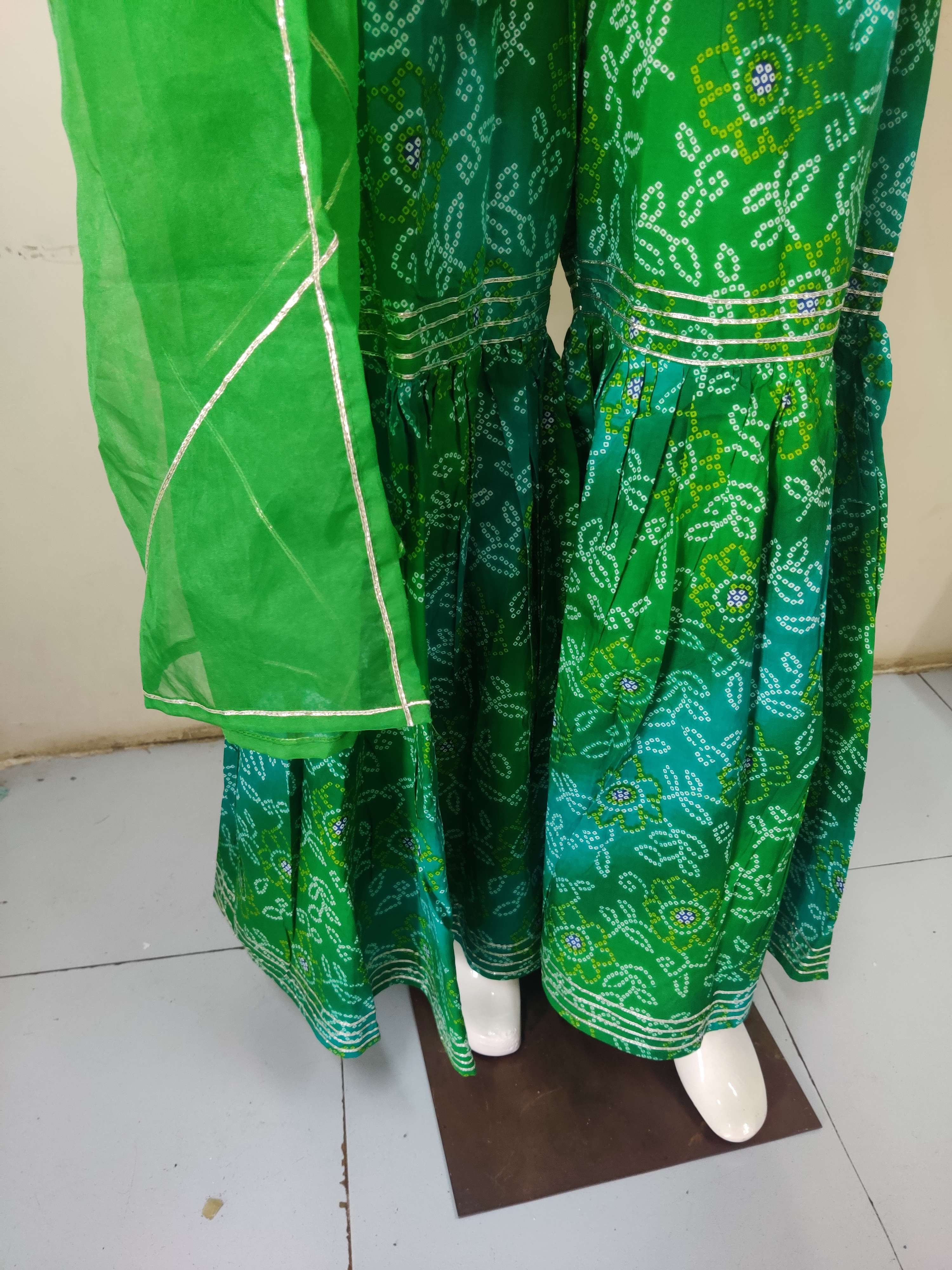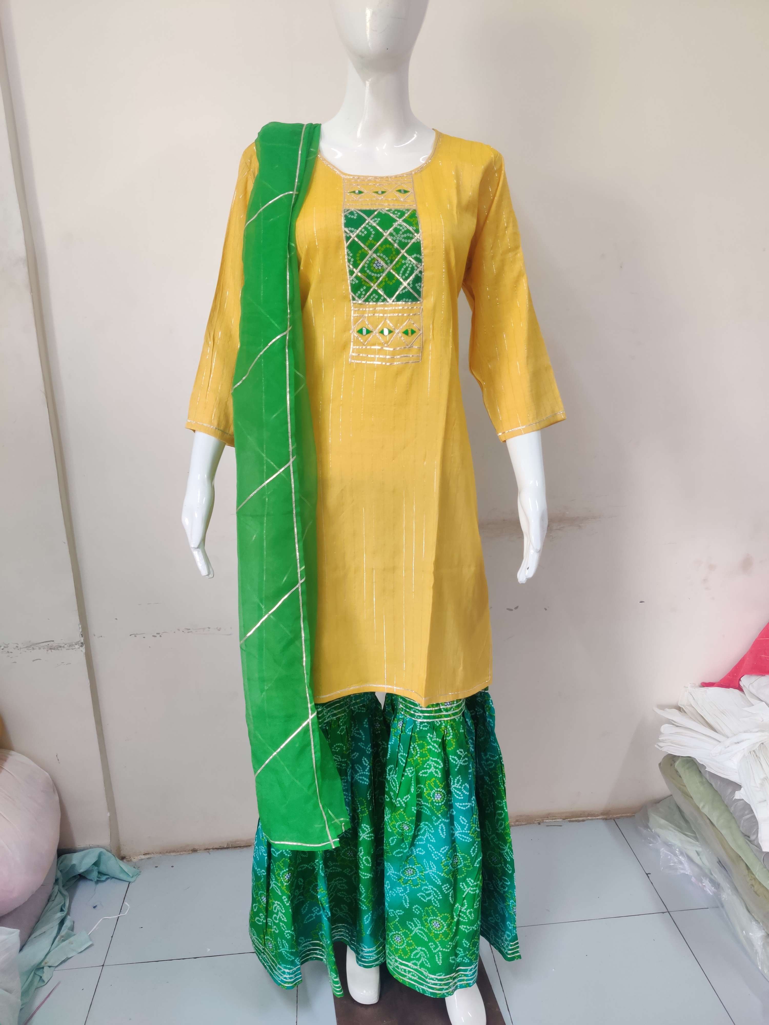 Heavy Rayon Lurex Top With Organza Dupatta And Cotton Bandhani Sharara