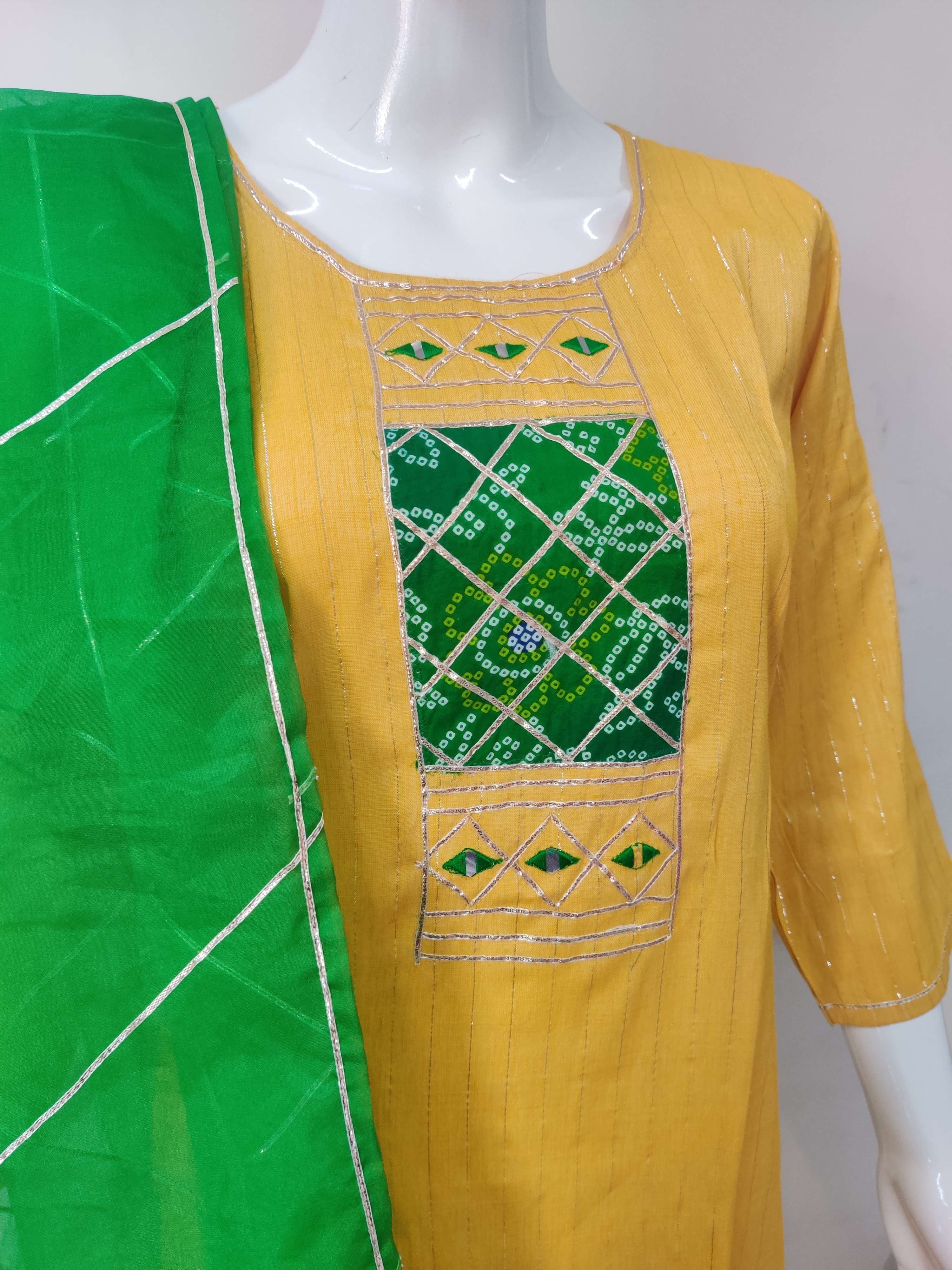 HEAVY RAYON LUREX TOP WITH HANDWORK, ORGANZA DUPATTA AND COTTON BANDHANI SHARARA WITH LACEWORK. SETWISE -SIZES- M, L, XL, XXL RATE - RS 820 + 5 % GST |