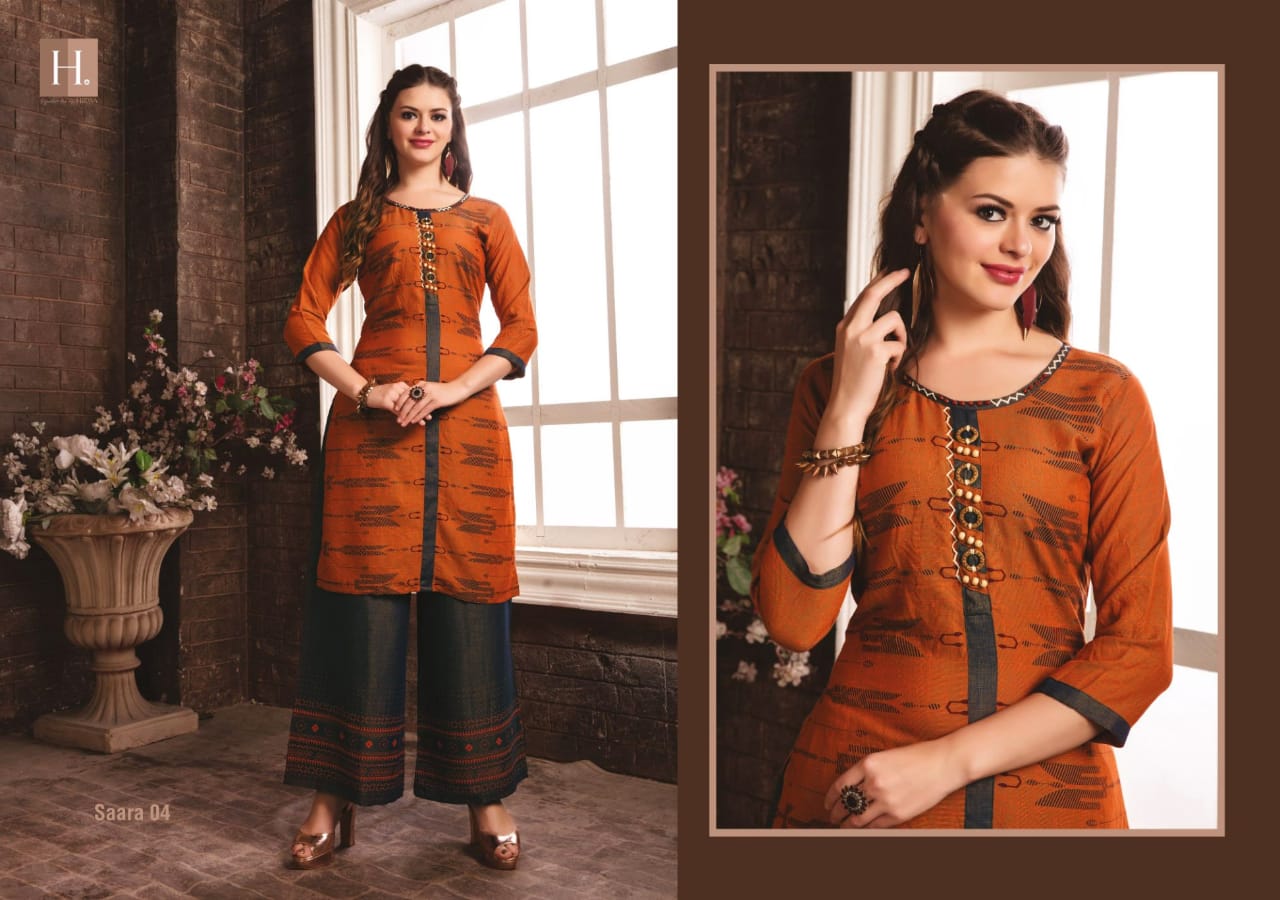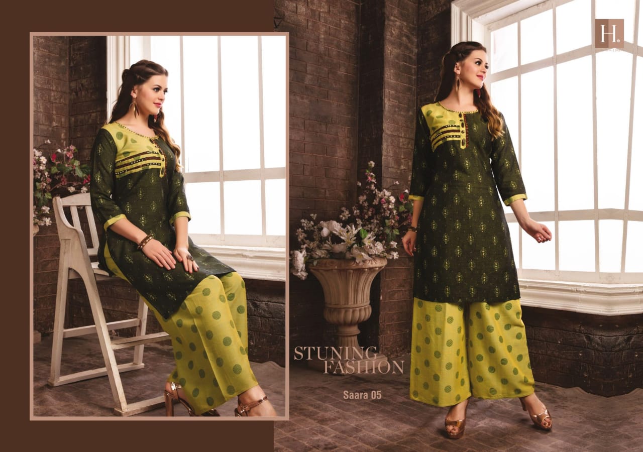 Catalog : SAARA Brand : Itrana Size : M, L, XL, XXL, Length : 48" Type: Kurties Fabric : Cottan Sarttin aww. PRICE PER PEC 725/- NET ONLY GST EXTRA No. Of Designs : 09 |