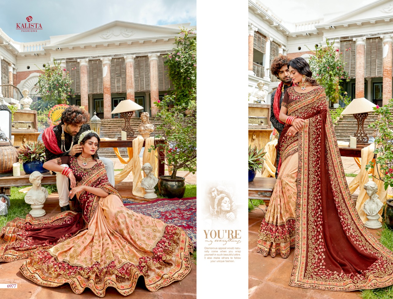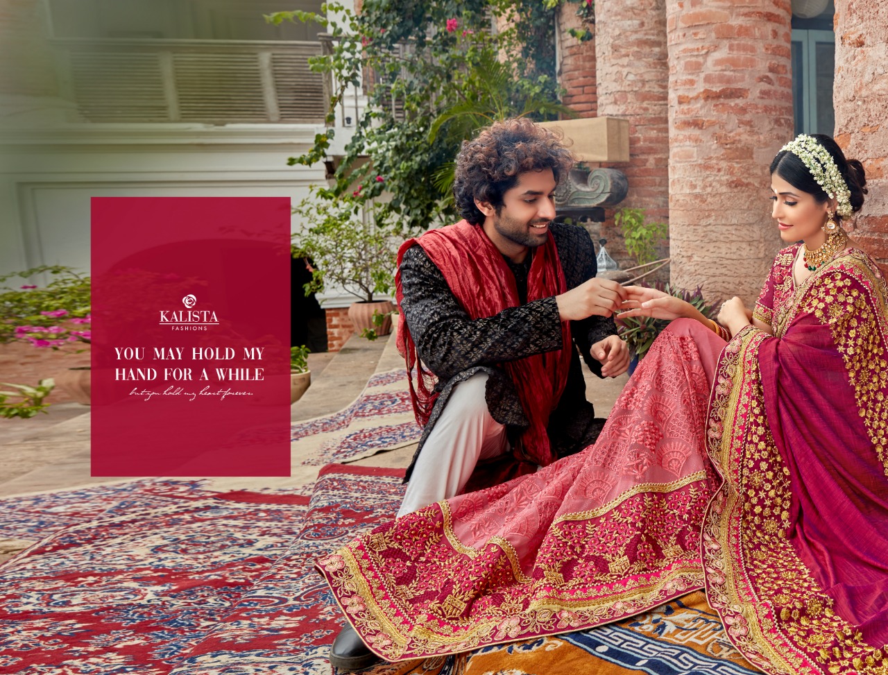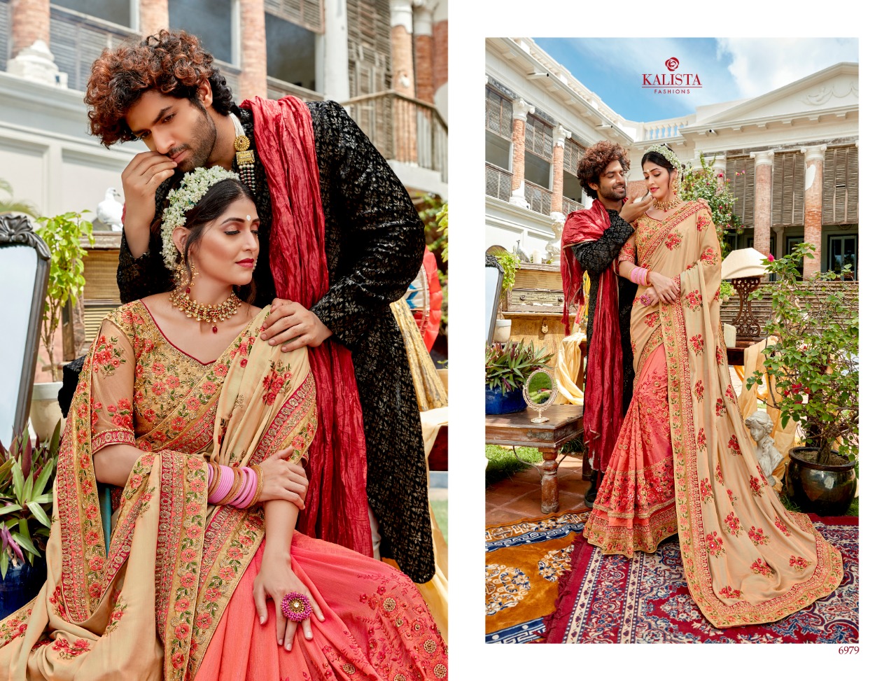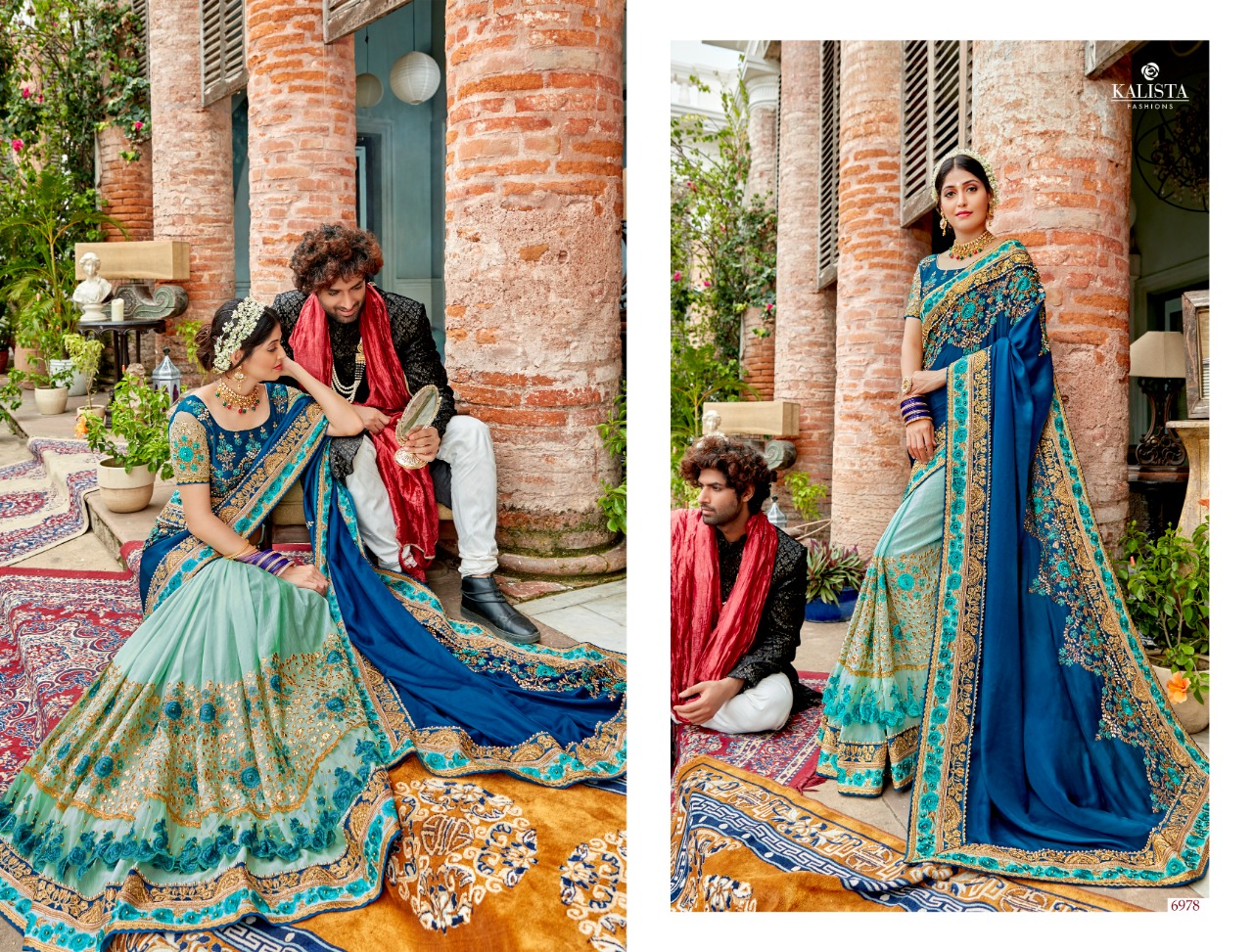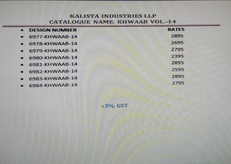 kalista fashions catalog name: khwaab14 rate list : attached Rate ave - 2745/-₹ fabric : heavy pure Georgette availablility: set to set |