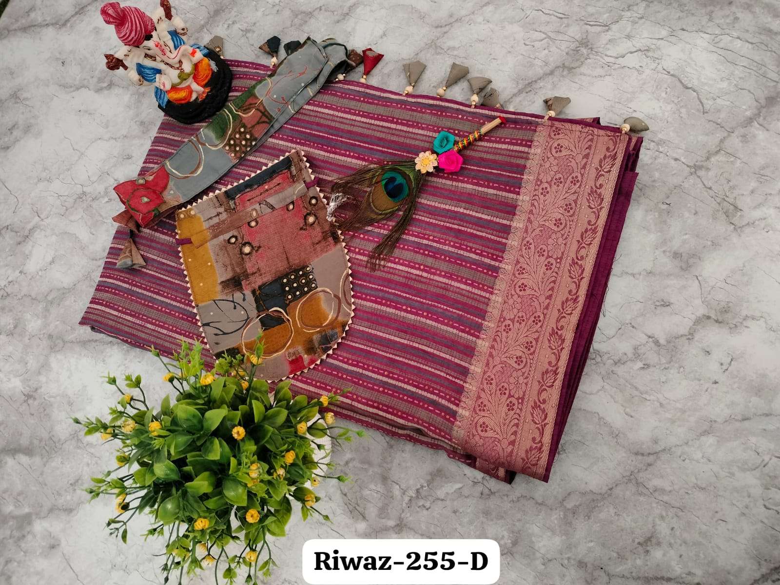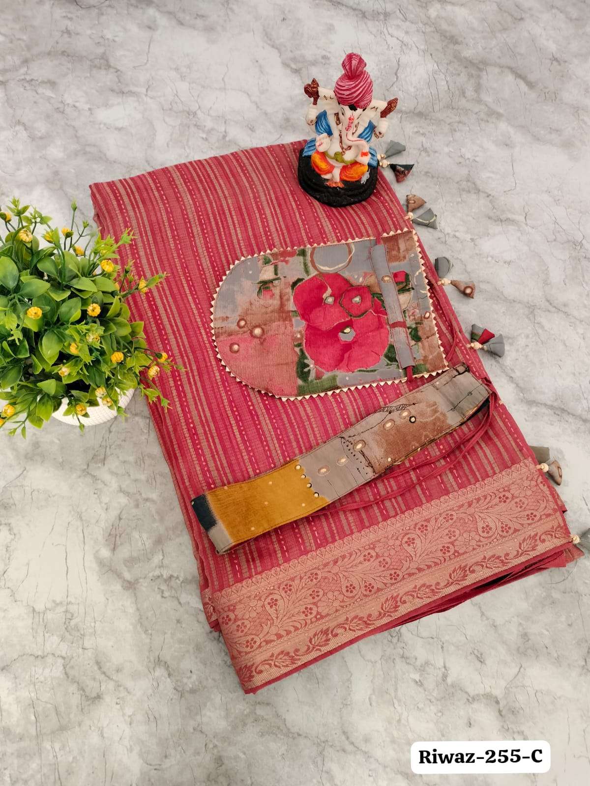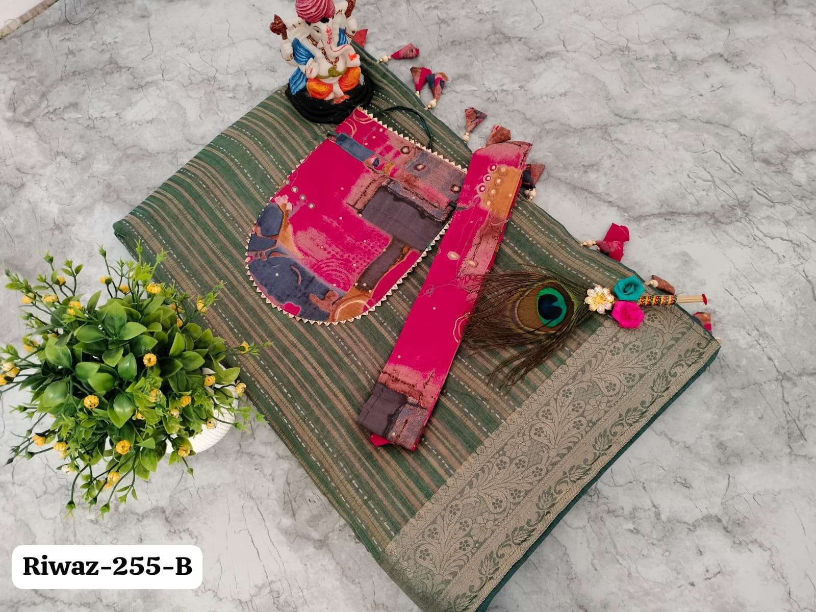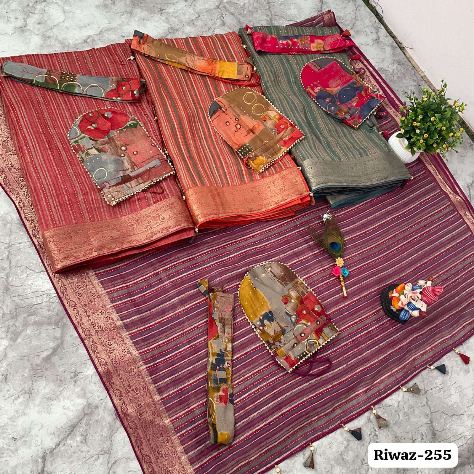 Riwaz 255 no. -1100/- Fabric: silk Georgette Concept: jari patta saree with lining design with matching belt with purse 👛 Blouse: print blouse Packing : 23-09-2023📌 |