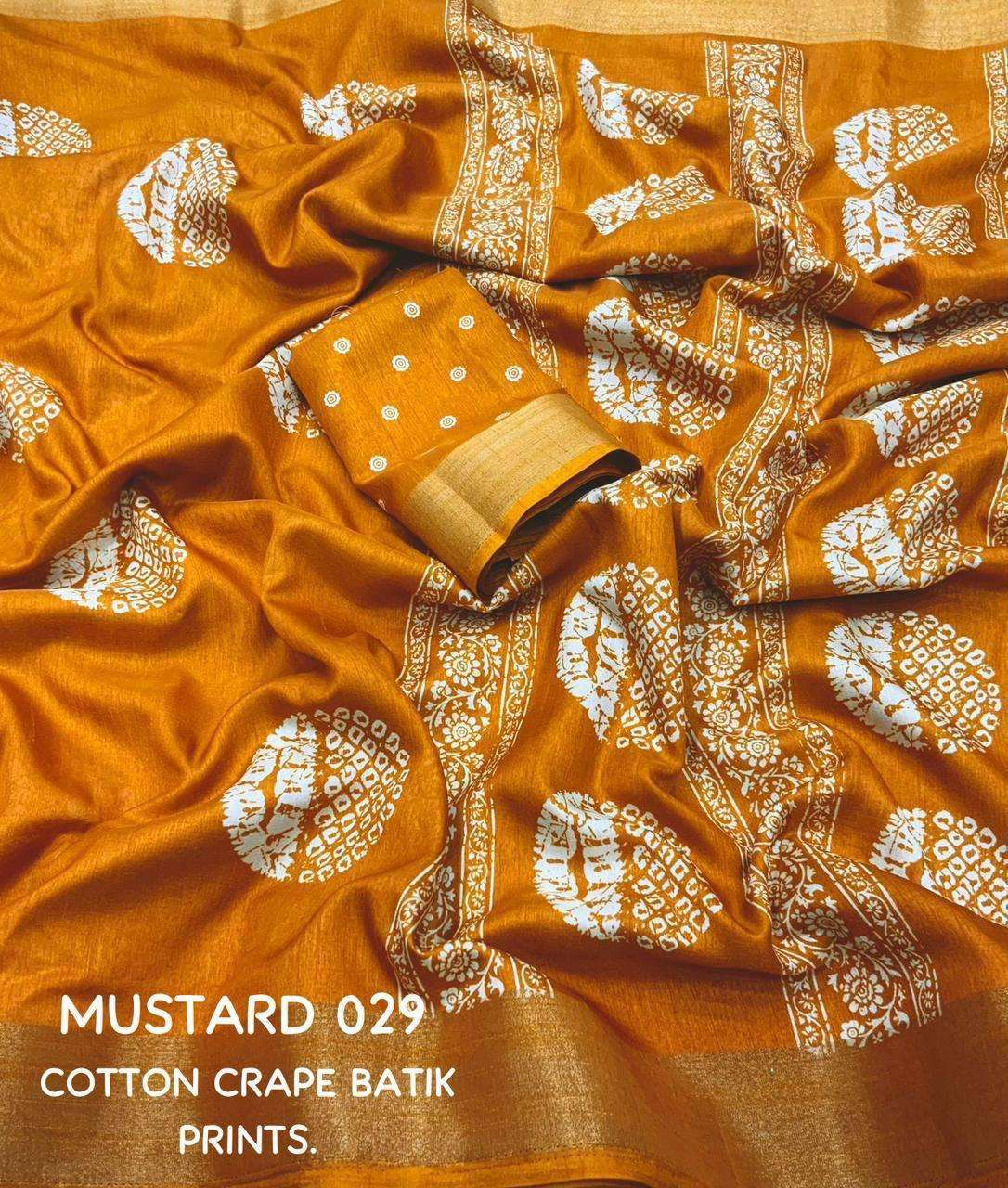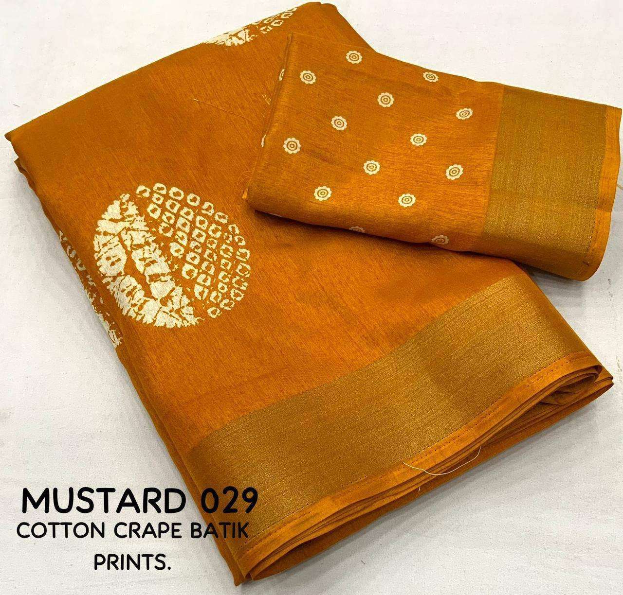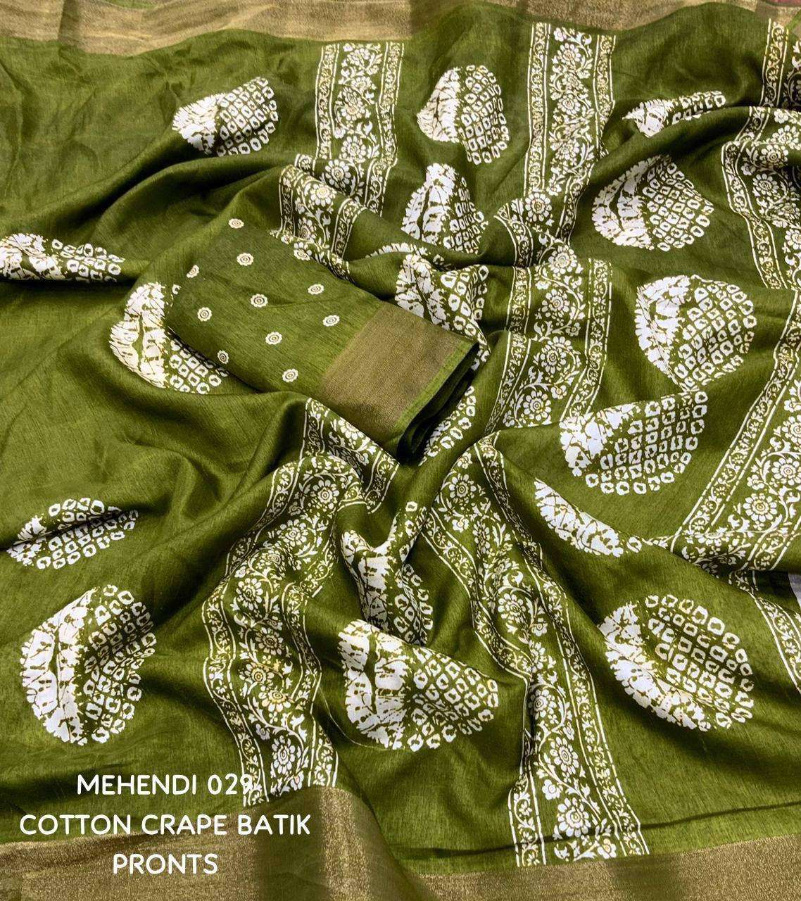 BEST SELLER BACK IN STOCK New cotton crape batik style printed saree. KC- 029 KC- cotton crape (batik edition) Quality- soft cotton crape batik prints with zari pattu woven border. Blouse- runing cotton crape separate print blouse. Rate- 499/- +ship Top trusted quality |