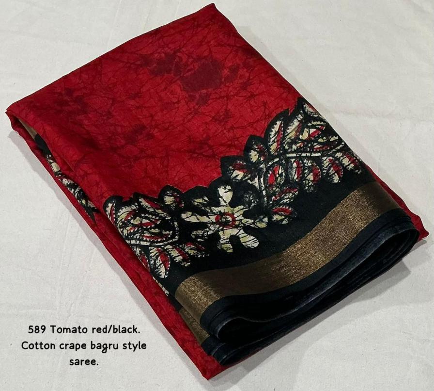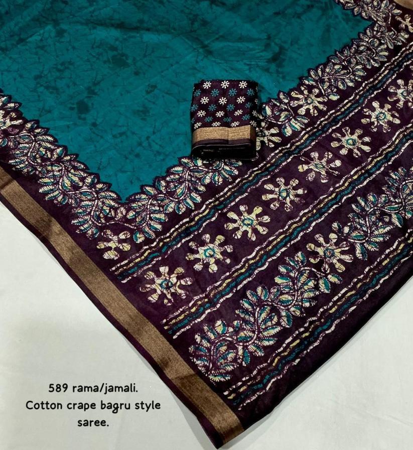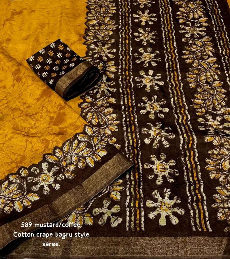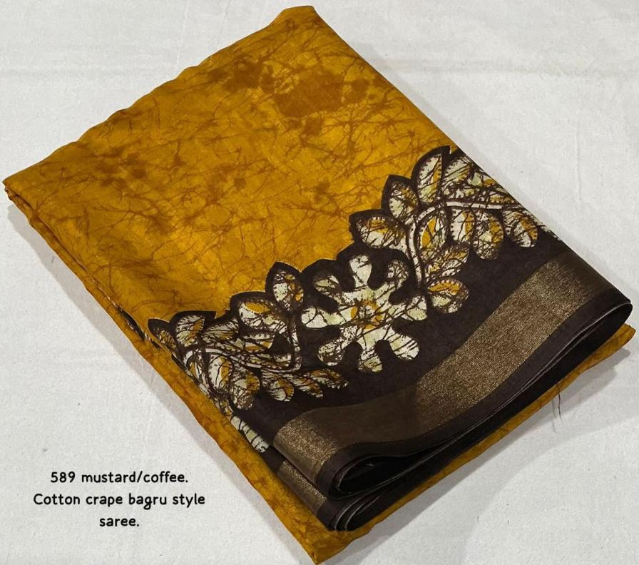 new arrivals New fancy bagru style printed saree from ak. kc 589 Kadambari d-5 Soft cotton crape saree with zari pattu woven border. Bagru style batik prints. Running printed blouse. Rate - 499+ship. Top trusted quality |