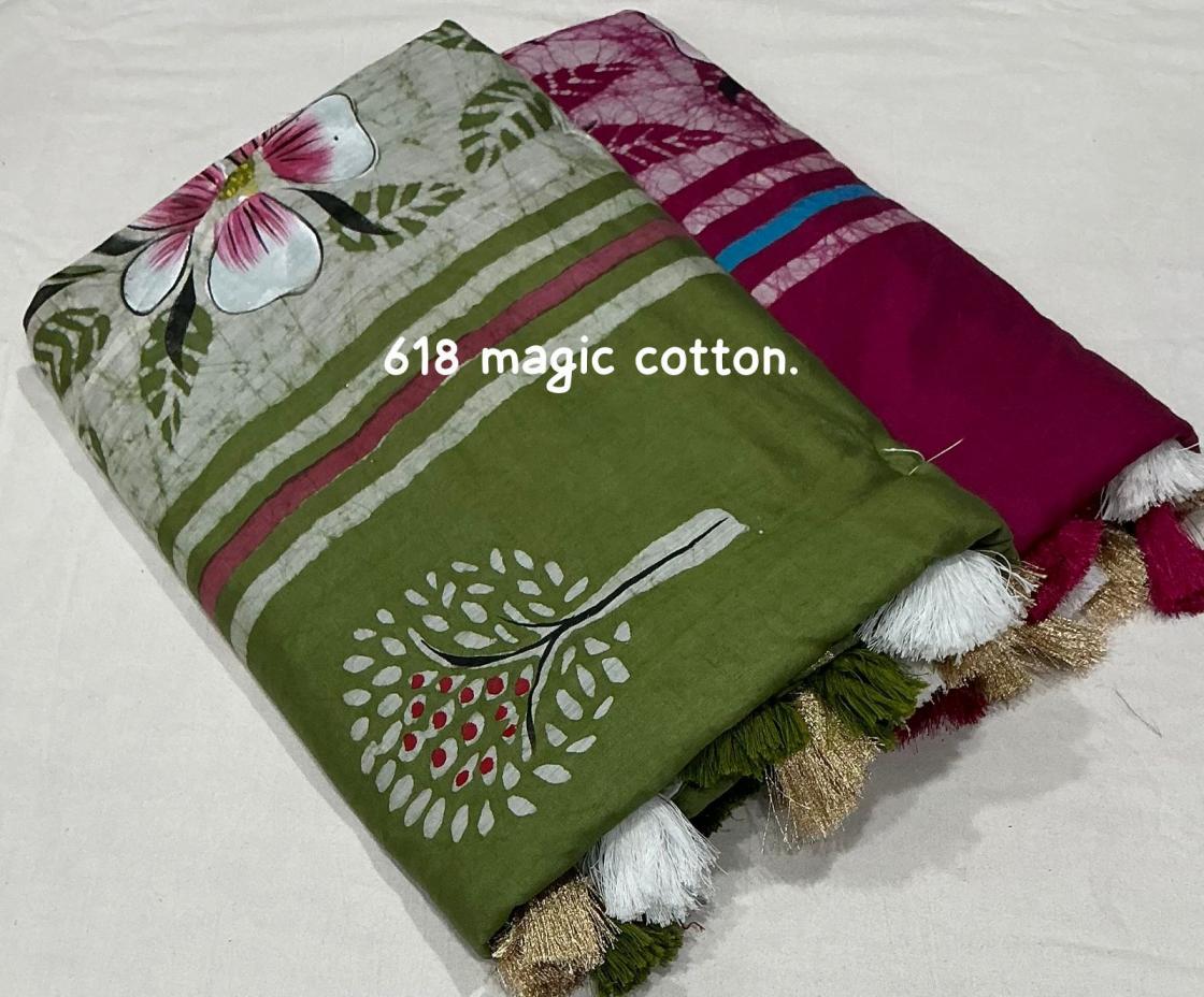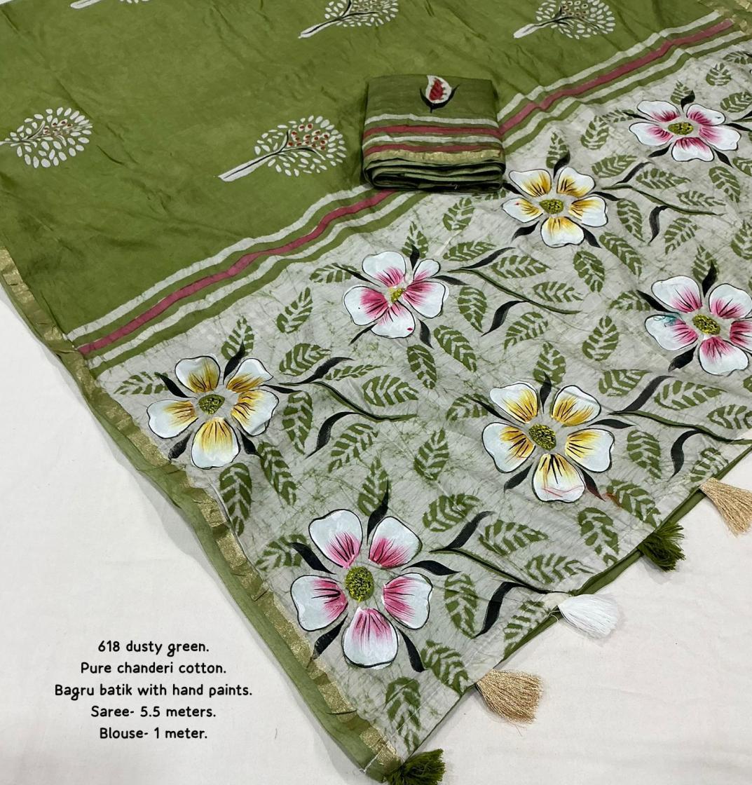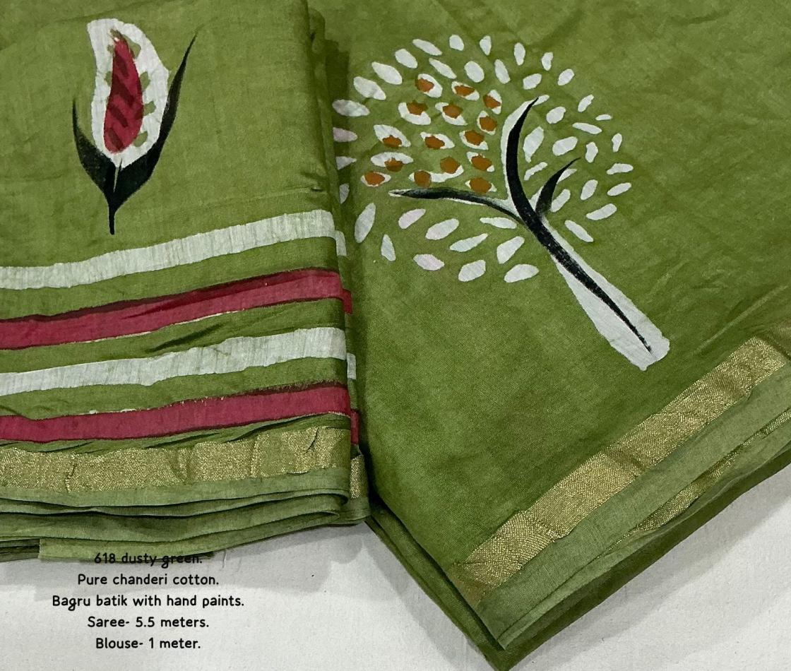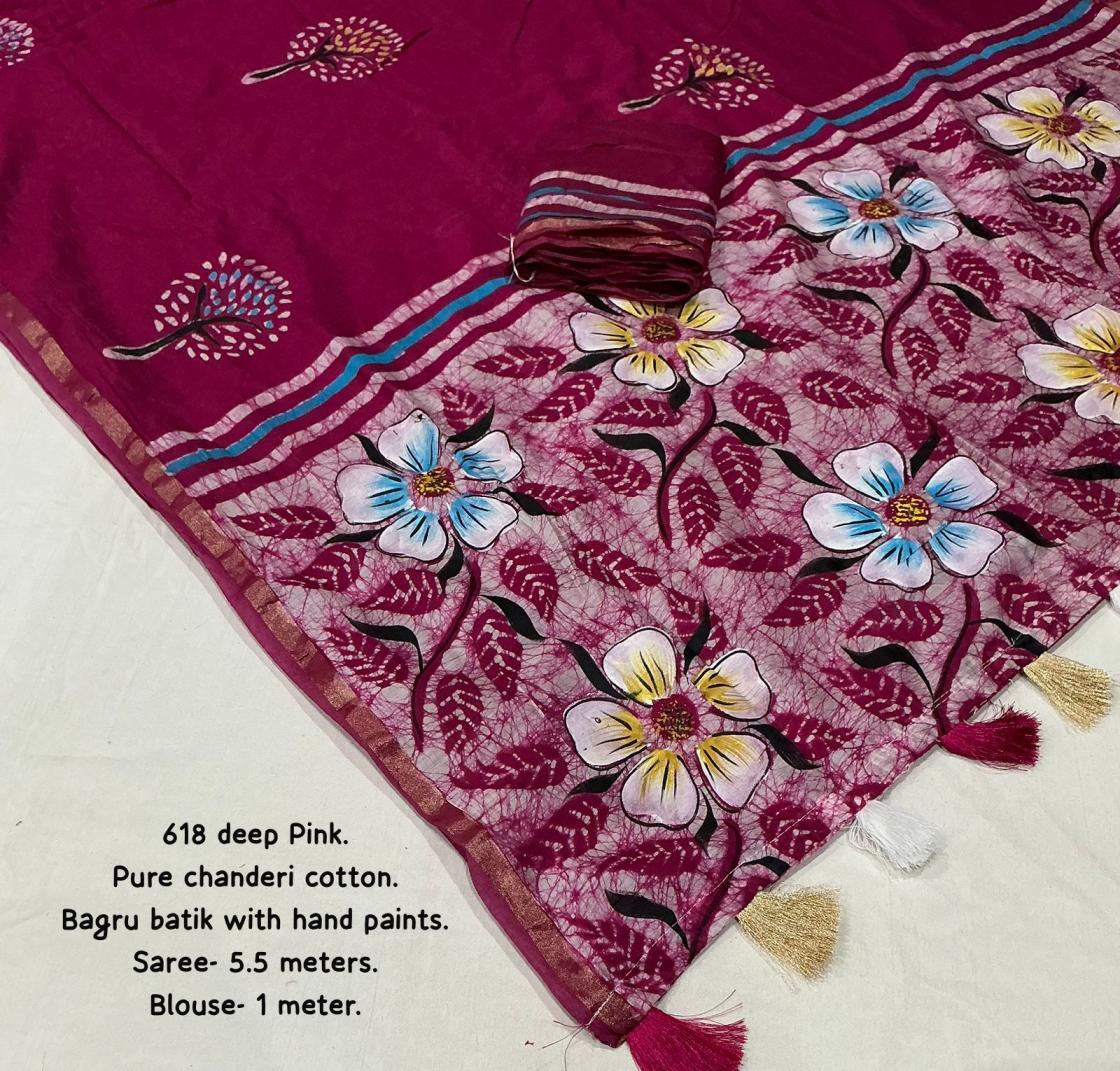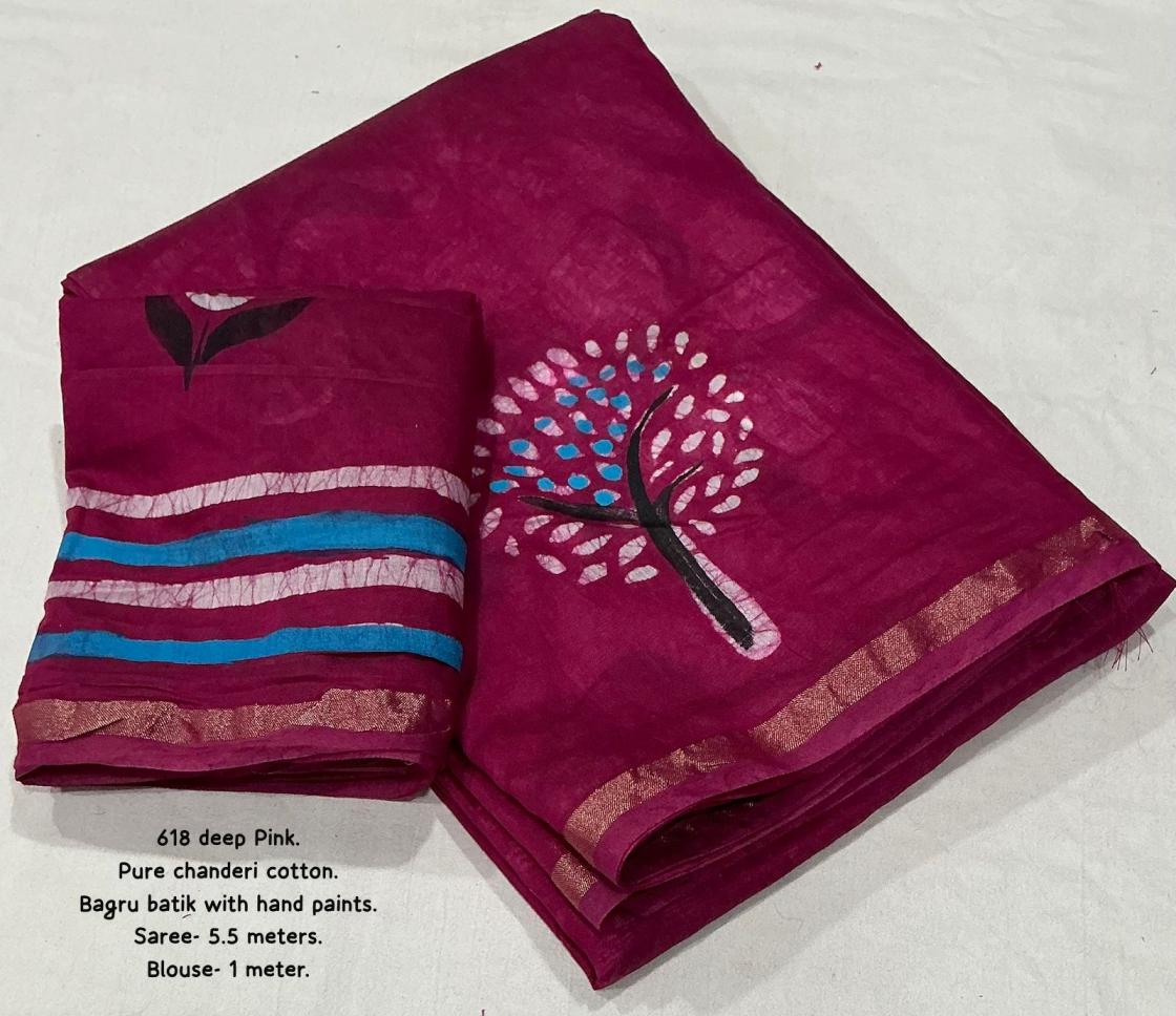 new arrivals New addition pure chanderi collection. Handcrafted bagru batik painted saree. kc - 618 mira batik. Pure chanderi cotton saree with zari woven pattu. Beautiful combination of bagru batik prints with had. Painted foral designs. Cotton tassels on pallu. Running pure chanderi blouse with bagru batik prints. Rate - 1350+ship. Top trusted quality |