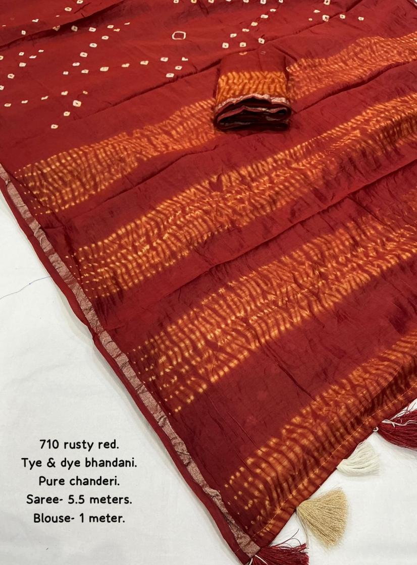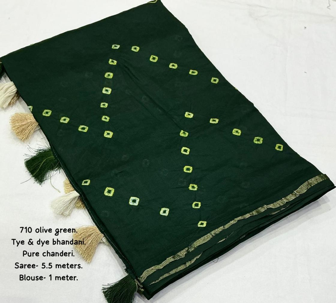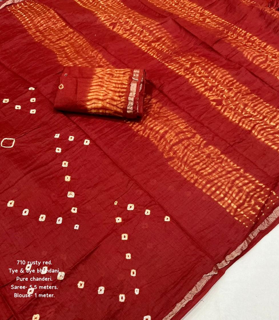 new arrivals New pure chanderi hand tye & dye bhandani saree. kc - 710 magic bhandani. Pure chanderi saree with zari pattu border. Hand tye. & dye bhandani style designs. Cotton tassels on pallu. Running pure chanderi blouse with bhanani designs and aari mirror. Rate - 1250+ship. Top trusted quality |