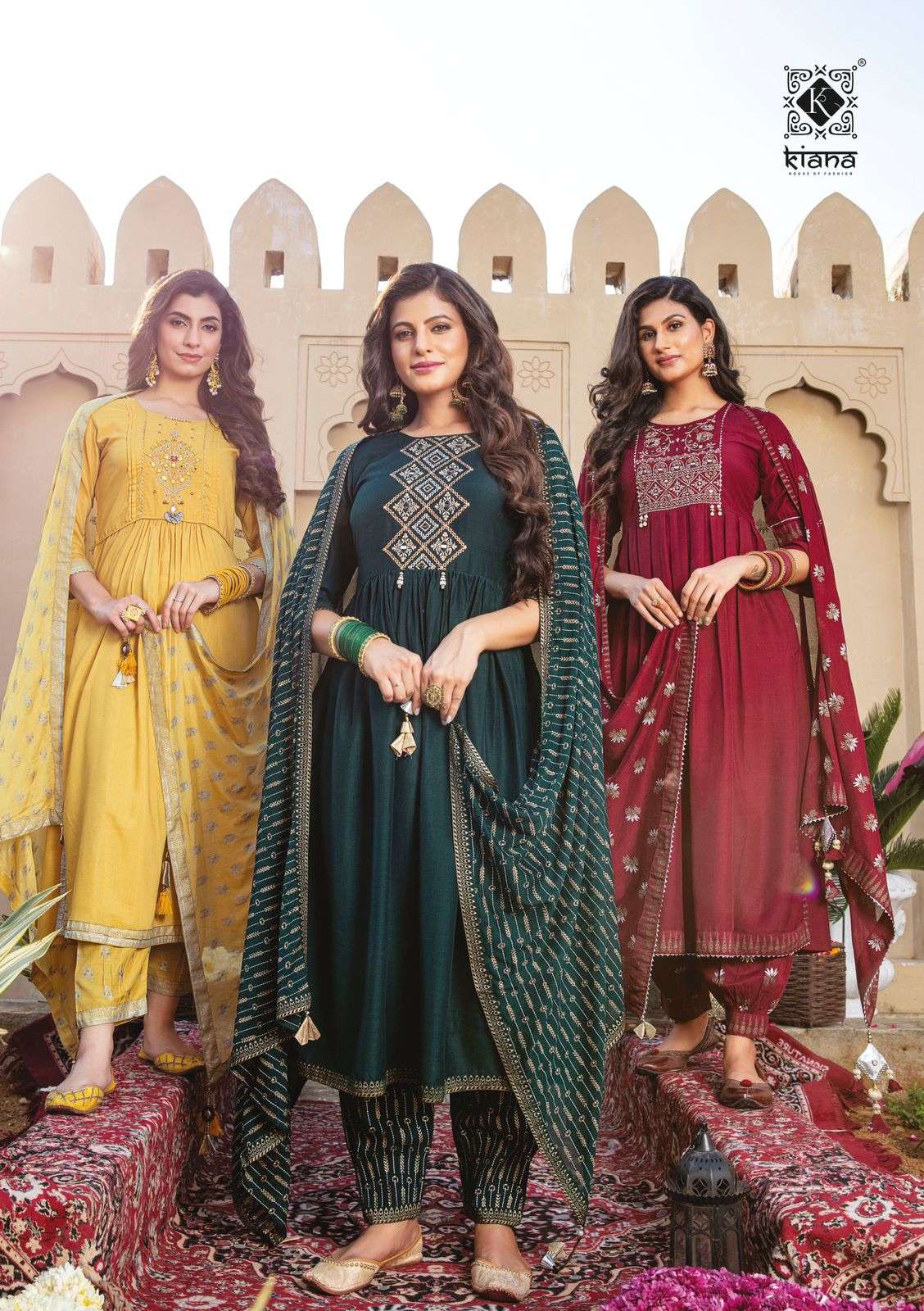 The Test of festival Collection 💥✨ 👑Kiana ®️👑 Catalogue Name- 👗Top :- Heavy Maslin with embroidery work and silver or gold print 🔥 Note :- Naira cut and Hand original mirror work Bottom:-Heavy Maslin Silver or gold print Patiyala and pents Style Dupatta:- Pure Chinon Gold or silver prints and Four side printed less patti work and extra Accessories 🎗Size :- M(19) L(20) XL(21) XXL(22) 3xl(23) ☣Designs :- 6 pcs |