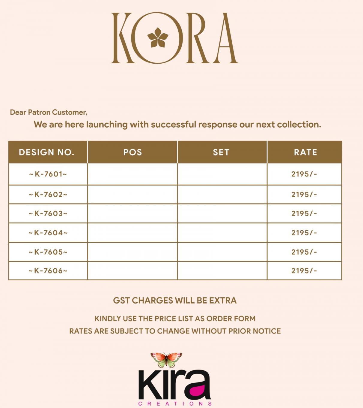 Kira Creation Presents Latest Collection Launched on 20-08-2025. Presenting Beautiful collection of 6 PCS with Unstitched .