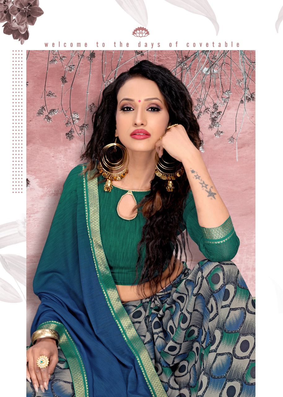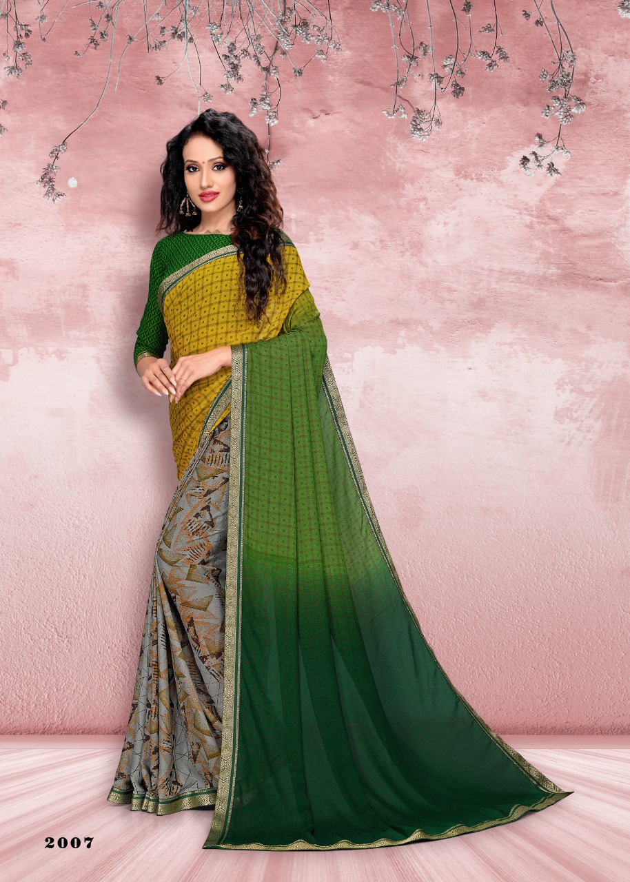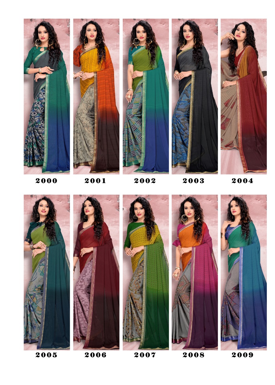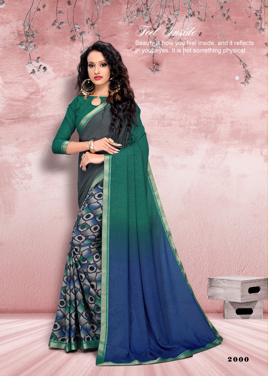 KODAS Brand Launched New Saree catalog Catalog Name : ELANTE 4 Fabric : RENNIAL PRINTED SAREE WITH BORDER MOQ - 10 Box Rate : 319/- +5% GST Without Box Rate - 299/- + 5 % GST Work : Printed With Border saree Length : 6 mtr Only full set |