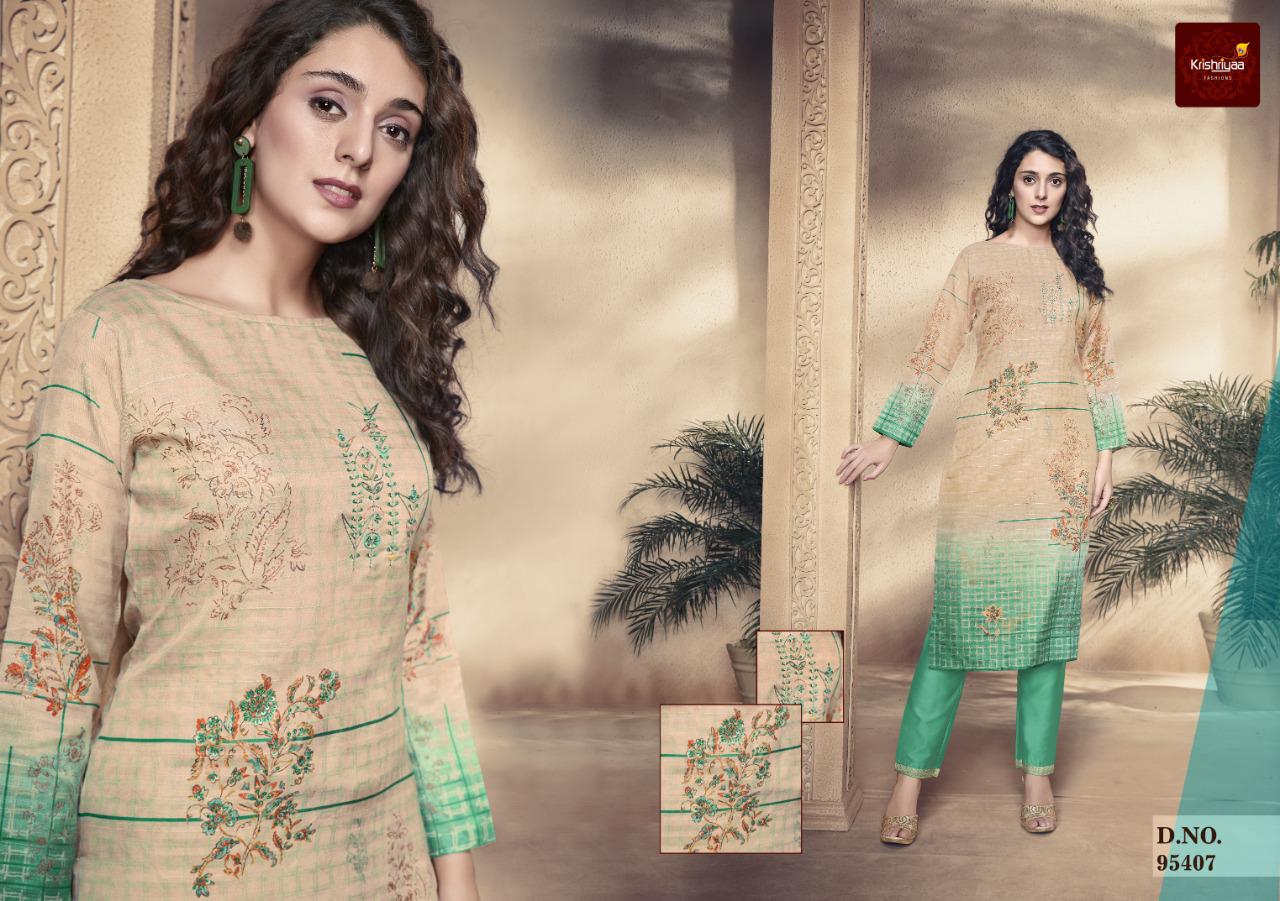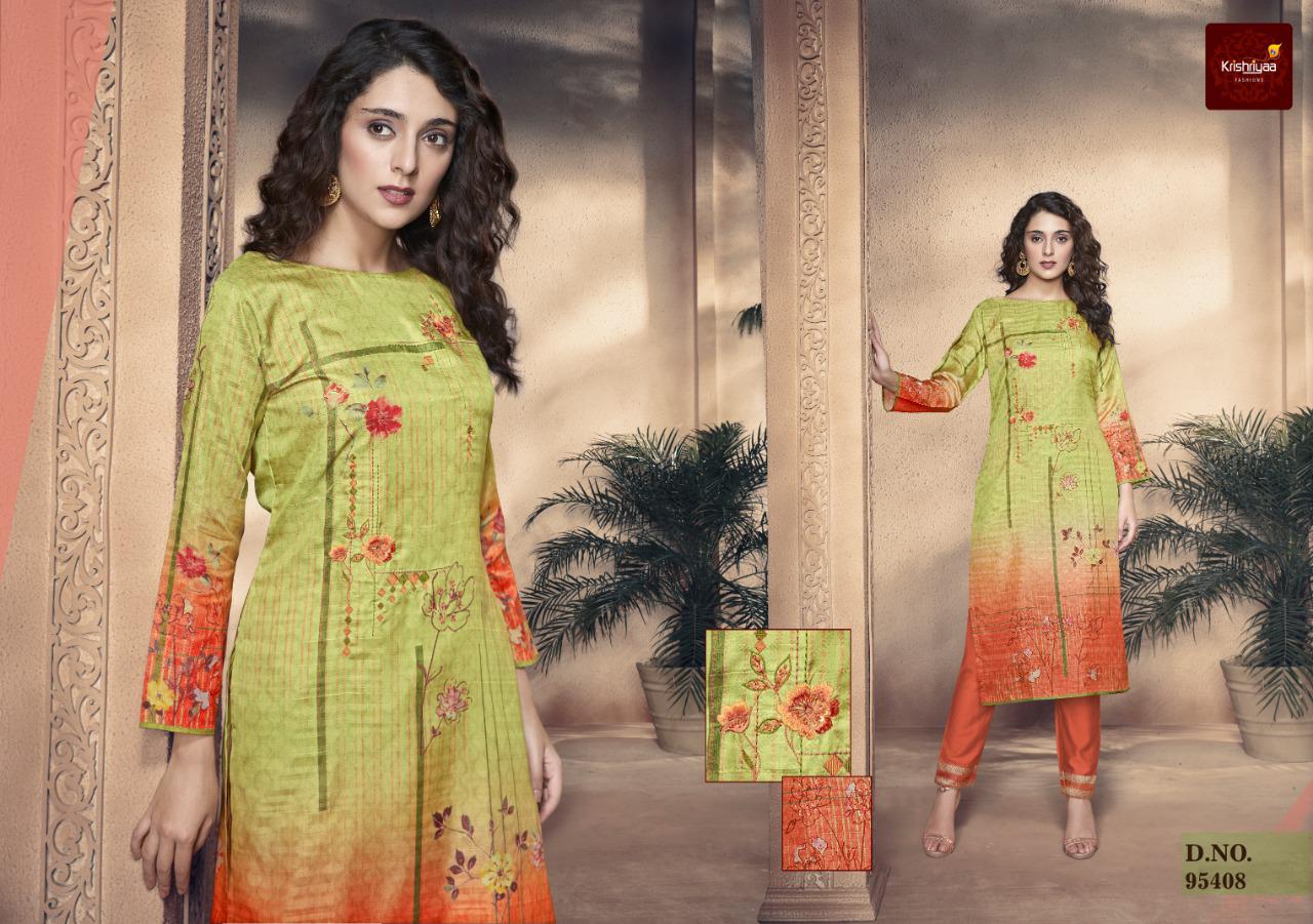 Krishriyaa ™ is proud to launch its latest Festive ensemle Elegance A collection of Silk Digital Printed Kurtis enriched with Splendid Embroidery and Handwork paired with Pants beautified with Jaqaurd Borders Catalog: Elegance Kurti Fabric: Kolaveri Silk with Digital Print, Embroidery and Handwork Kurti Lining: Crepe Pant Fabric: Linen Cotton with Jaqaurd Border Pcs: 9 Sizes: M,L, XL, XXL Price: 945 Booking Started Dispatch from 14 September Limited Stock Book your Orders Soon |