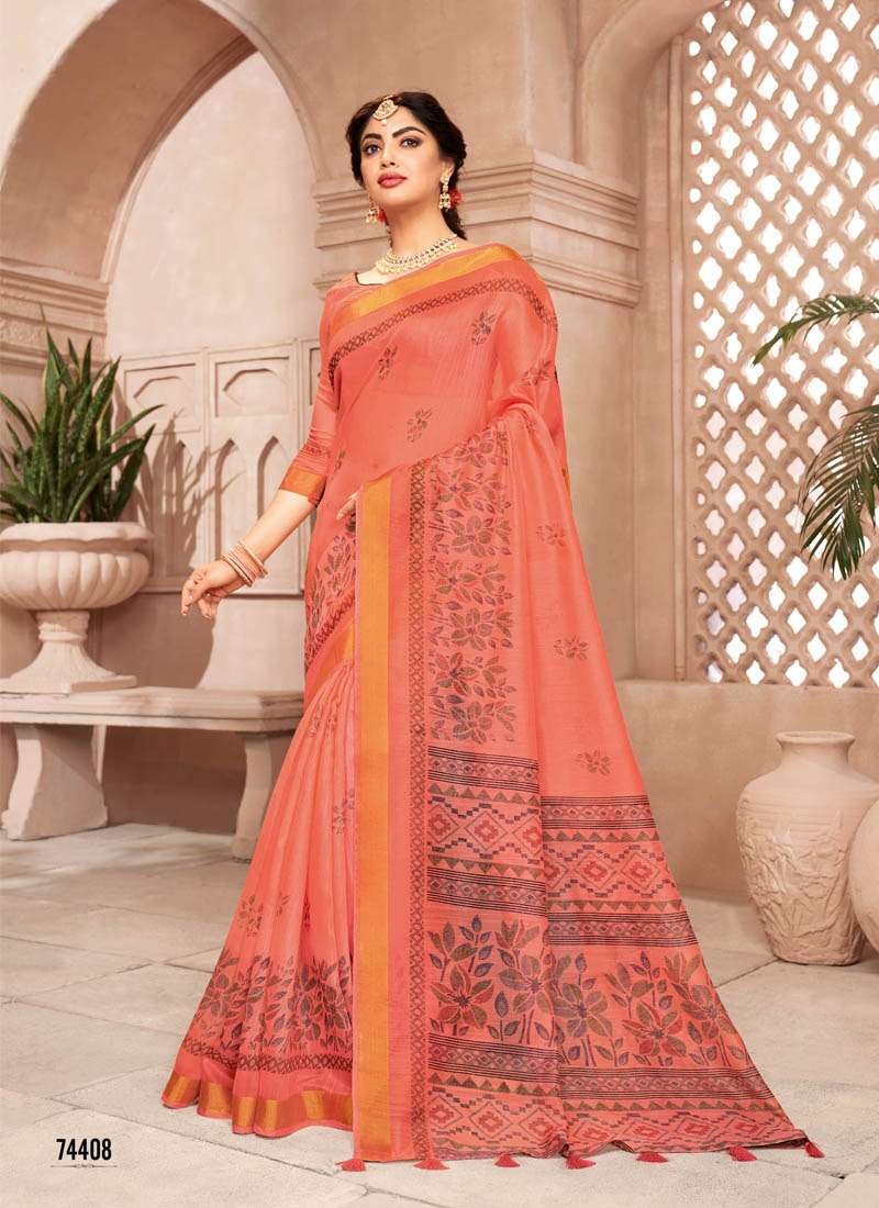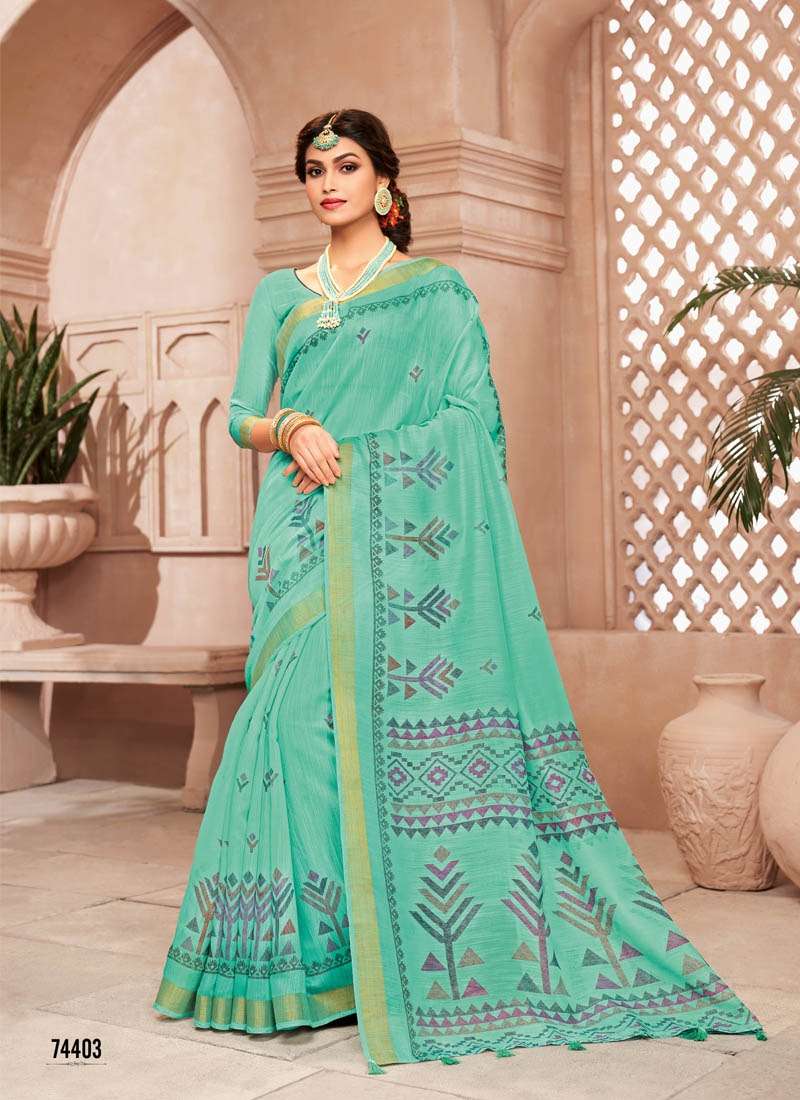 Brand = LIFESTYLE  Catalog :- VIVANTA COTTON Volume :- 4 Fabric :- LINEN FANCY COTTON PRINT Packing :- BOX Ex-mill Price :- 590 per pcs /- Cut/Length :- 6.30 Set to set . GST 5 Percent Extra FANCY COTTON PRINT SAREE WITH JARI BORDER PACKING - Today |