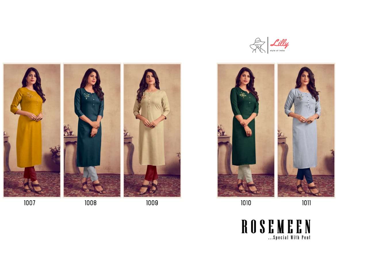 ROSEMEEN 5 pcs kurti with pent A product by LILLY-Style of india 5 kurtis with pent Beautiful catalogue Having designer Concept..    ~ Fabric * TOP:- pure Riyon 14 kg with khatli Hand work PENT:- Salub Riyon concept pent Size :- M-L-XL-XXL -3XL PCS â5 |