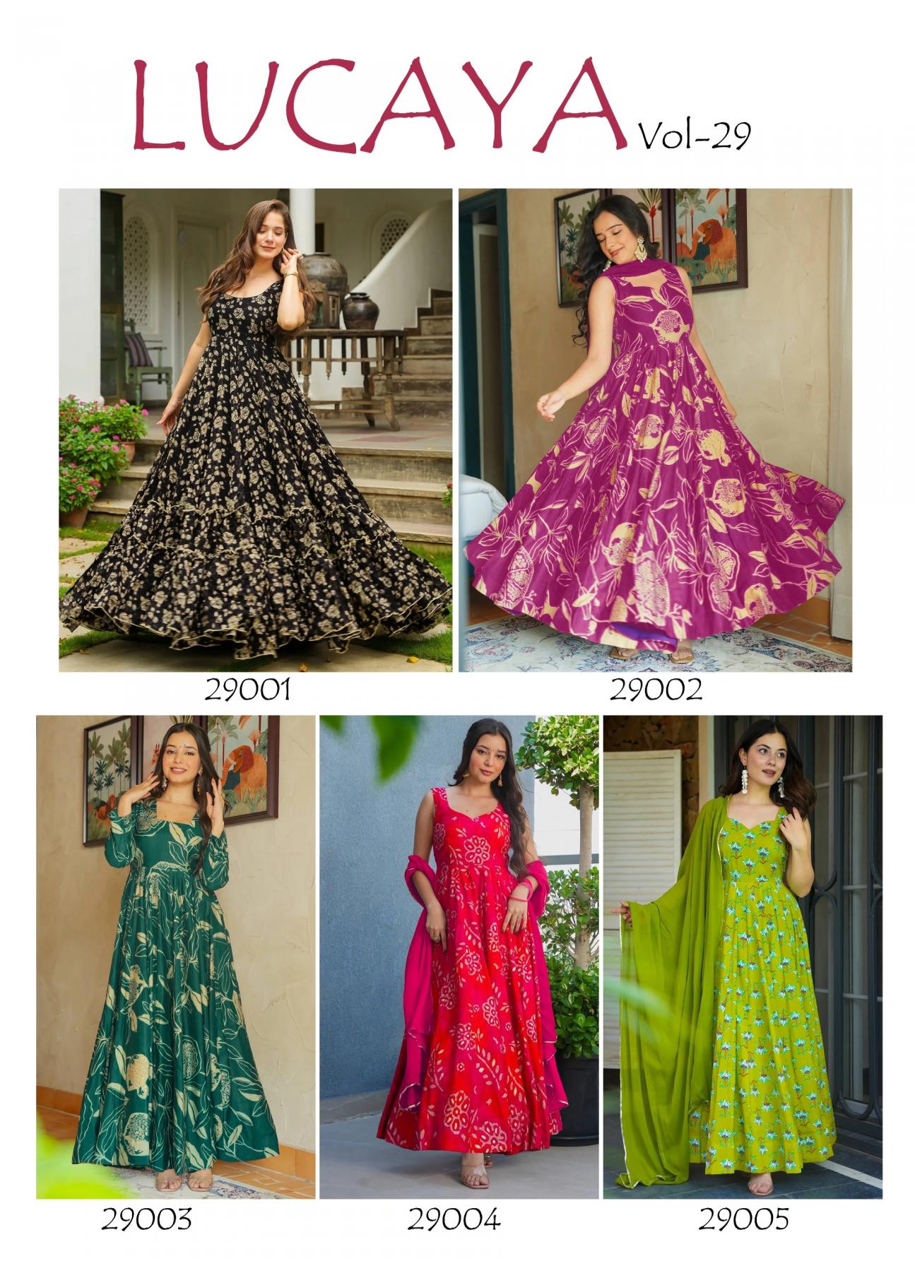 Lucaya Vol 29 (Ethnic wear) Universal fashion presents this stunning Beautiful digital printed Ethnic wear gown set collection (set of 5 beautiful design 29001 to 29005) Catalog name :- Lucaya vol 29 Product details Design no :- 29001 Fabric:- heavy gorget Design no:-29002 to 29005 Fabric: Heavy Rayon Stitched type :- Full stitched Dupatta fabric:- georgette Dupatta length :- 2.5mtr approx. Note:- Size: - XS(34),S(36),M(38),L(40),XL(42),XXL(44), 3XL(46), 4XL(48), 5XL(50), 6xl(52) (all size available) Occasion:- Festival Wear, Function, Ceremonial, Wedding Wear, Party Wear Note: - 10-12% Colour variations may occur due to different screen resolutions RATE: - 1149/- For all size GST : 5% |