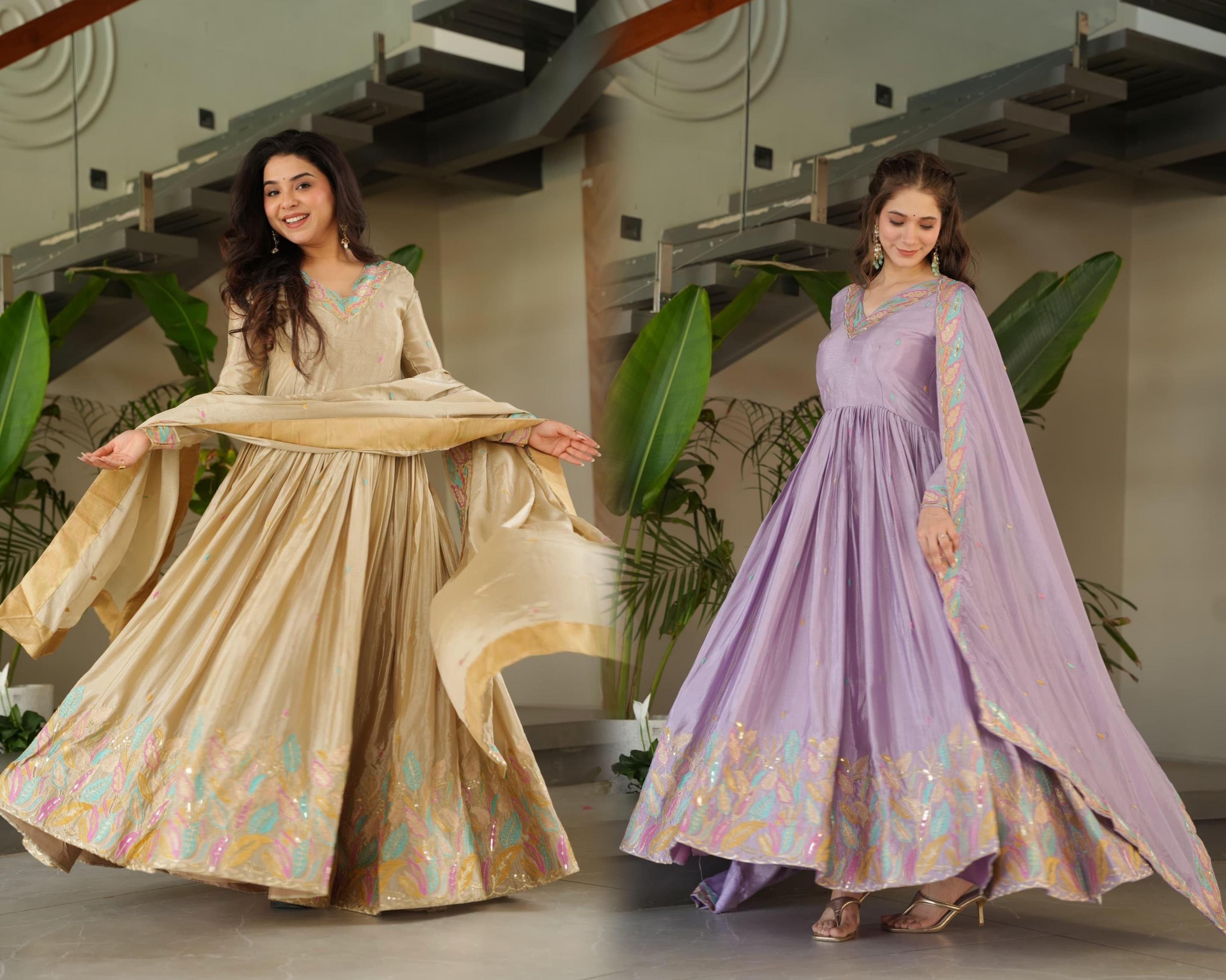🤳🏻 PREMIUM READYMADE GOWN-DUPATTA COLLECTIONS.💃🏻 #GOWNLOVE 💕 💗 Chinnon Fabric gown with Sequins & Multi Thread Embroidered Work, It looks graceful for women, it Designed to flatter all body types, gowns for women combine the best parts of western and Indian wear into one stunning ensemble. 💝 Code :- LW-9229 👉🏻 GOWN :-👇🏻 👉🏻 DUPATTA:- 👇 👉🏻 Colour :- 2 (Offwhite, Lovender) 👉🏻 PACKAGE CONTAIN :- Gown, Dupatta 👉🏻 WEIGHT :- 1.00 KG 👉🏻 BEST RATE :- 1600/-INR |