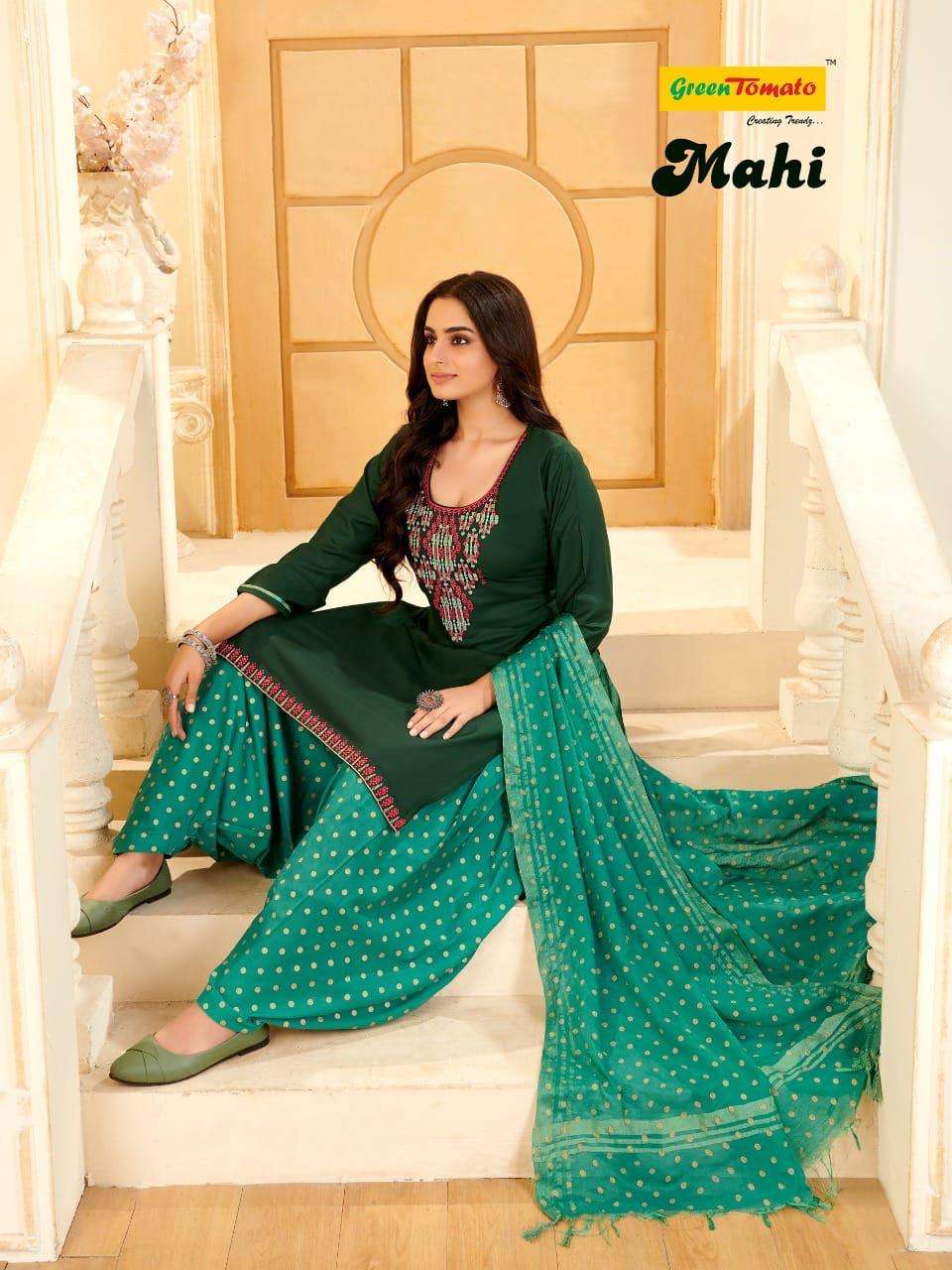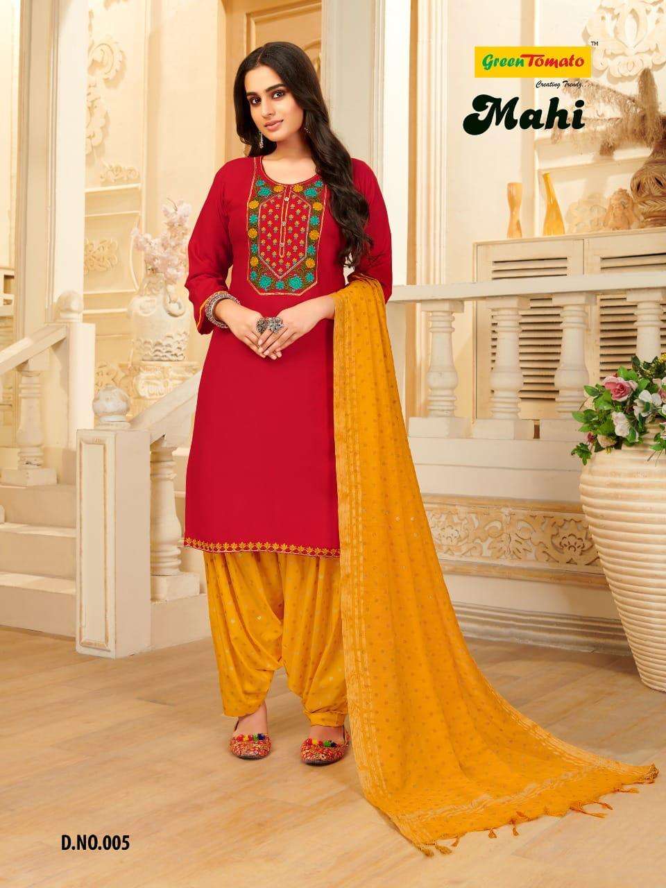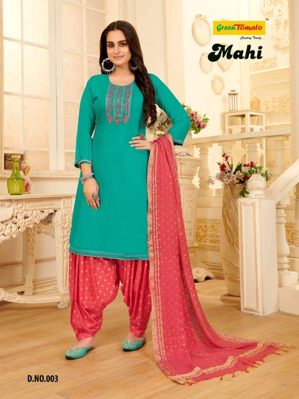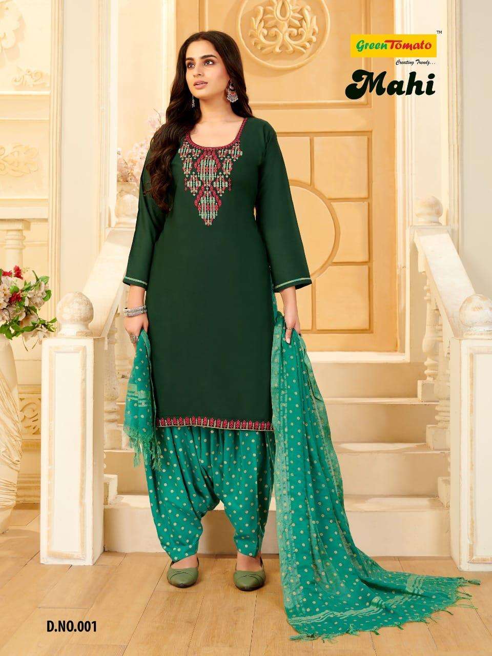MAHI BY GREEN TOMATO HEAVY RAYON 3PCS READYMADE PATIYALA SUIT CATALOG
