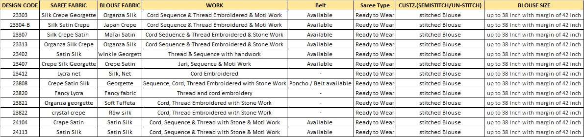 | Note | Stitching available on customer Requirment For Sarees , Salwar Kameez, Lehengha.(i.e M,L,XL,XXL). |